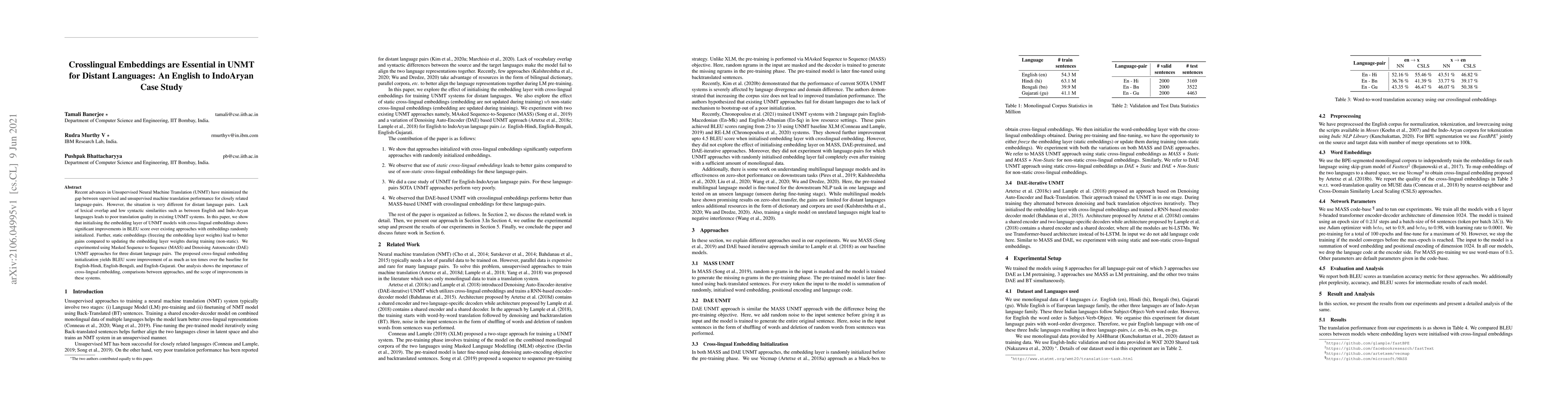 Recent advances in Unsupervised Neural Machine Translation (UNMT) have minimized the gap between supervised and unsupervised machine translation performance for closely related language pairs. However, the situation is very different for distant language pairs. Lack of lexical overlap and low syntactic similarities such as between English and Indo-Aryan languages leads to poor translation quality in existing UNMT systems. In this paper, we show that initializing the embedding layer of UNMT models with cross-lingual embeddings shows significant improvements in BLEU score over existing approaches with embeddings randomly initialized. Further, static embeddings (freezing the embedding layer weights) lead to better gains compared to updating the embedding layer weights during training (non-static). We experimented using Masked Sequence to Sequence (MASS) and Denoising Autoencoder (DAE) UNMT approaches for three distant language pairs. The proposed cross-lingual embedding initialization yields BLEU score improvement of as much as ten times over the baseline for English-Hindi, English-Bengali, and English-Gujarati. Our analysis shows the importance of cross-lingual embedding, comparisons between approaches, and the scope of improvements in these systems.
