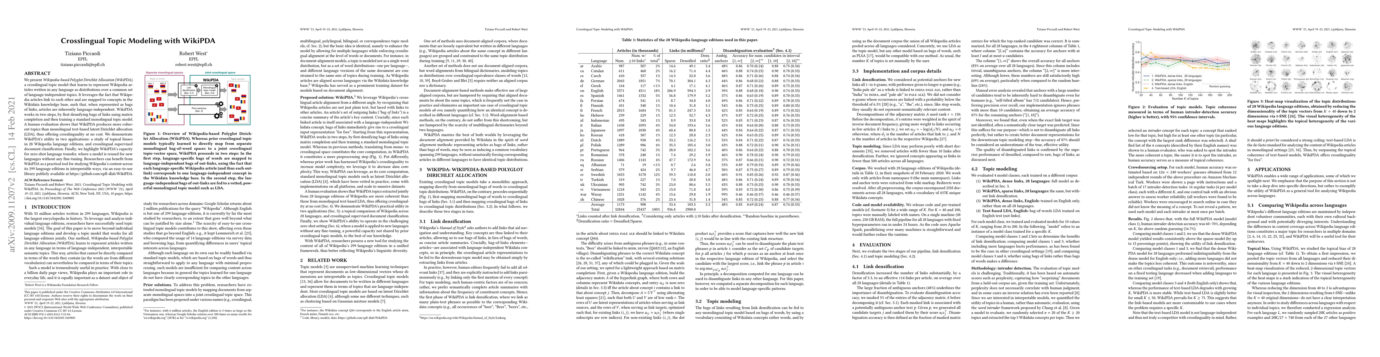 WikiPDA is a crosslingual topic model that represents Wikipedia articles across languages using a common set of topics, leveraging inter-language links and Wikidata. It demonstrates superior coherence in topic modeling and supports zero-shot language transfer without fine-tuning.