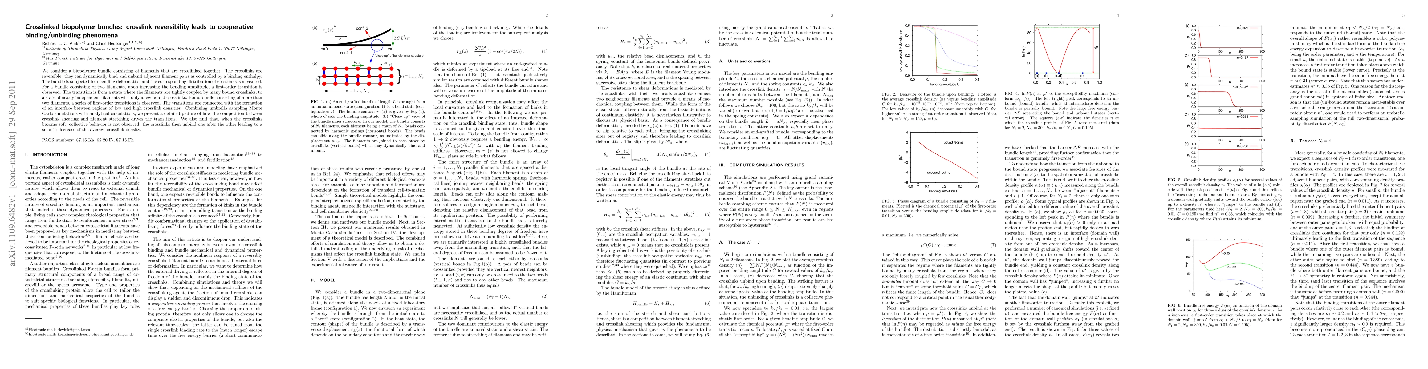 Researchers studied reversible crosslinks in biopolymer bundles under bending deformation, finding that the competition between crosslink shearing and filament stretching drives first-order transitions to more or less tightly coupled filaments.