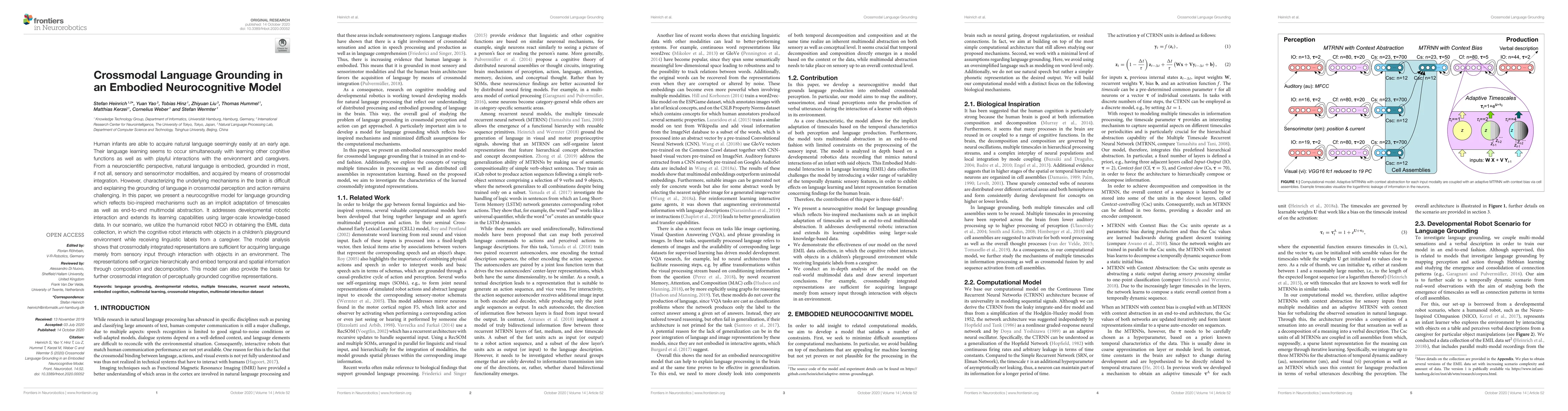 Human infants are able to acquire natural language seemingly easily at an early age. Their language learning seems to occur simultaneously with learning other cognitive functions as well as with playful interactions with the environment and caregivers. From a neuroscientific perspective, natural language is embodied, grounded in most, if not all, sensory and sensorimotor modalities, and acquired by means of crossmodal integration. However, characterising the underlying mechanisms in the brain is difficult and explaining the grounding of language in crossmodal perception and action remains challenging. In this paper, we present a neurocognitive model for language grounding which reflects bio-inspired mechanisms such as an implicit adaptation of timescales as well as end-to-end multimodal abstraction. It addresses developmental robotic interaction and extends its learning capabilities using larger-scale knowledge-based data. In our scenario, we utilise the humanoid robot NICO in obtaining the EMIL data collection, in which the cognitive robot interacts with objects in a children's playground environment while receiving linguistic labels from a caregiver. The model analysis shows that crossmodally integrated representations are sufficient for acquiring language merely from sensory input through interaction with objects in an environment. The representations self-organise hierarchically and embed temporal and spatial information through composition and decomposition. This model can also provide the basis for further crossmodal integration of perceptually grounded cognitive representations.