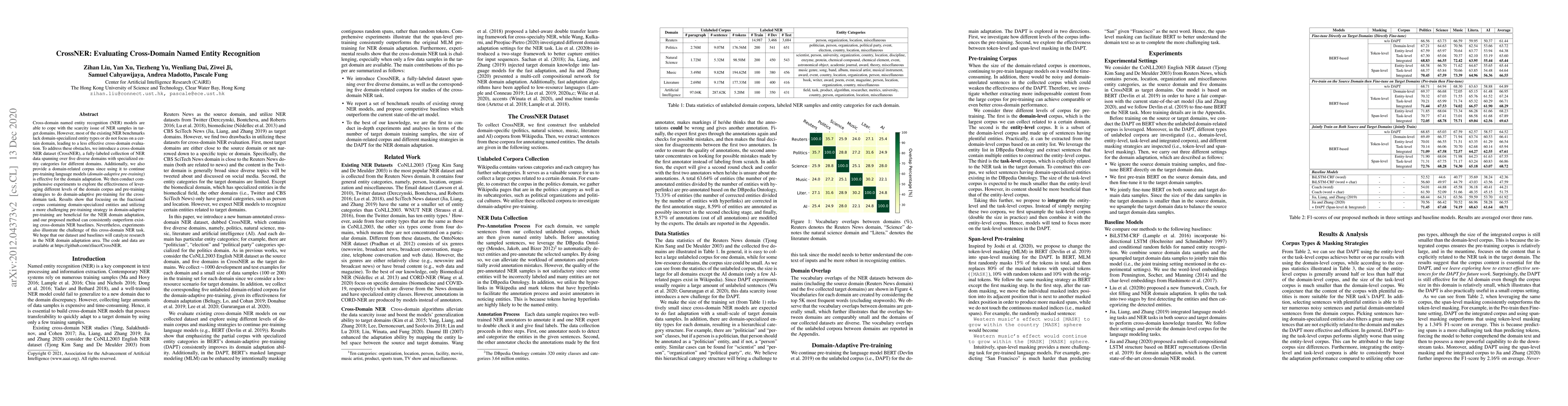 This paper introduces CrossNER, a new cross-domain named entity recognition dataset with specialized entity types across five diverse domains, and evaluates the effectiveness of domain-adaptive pre-training. Experiments show that using domain-specific corpora and advanced pre-training strategies improves cross-domain NER performance, outperforming existing baselines.