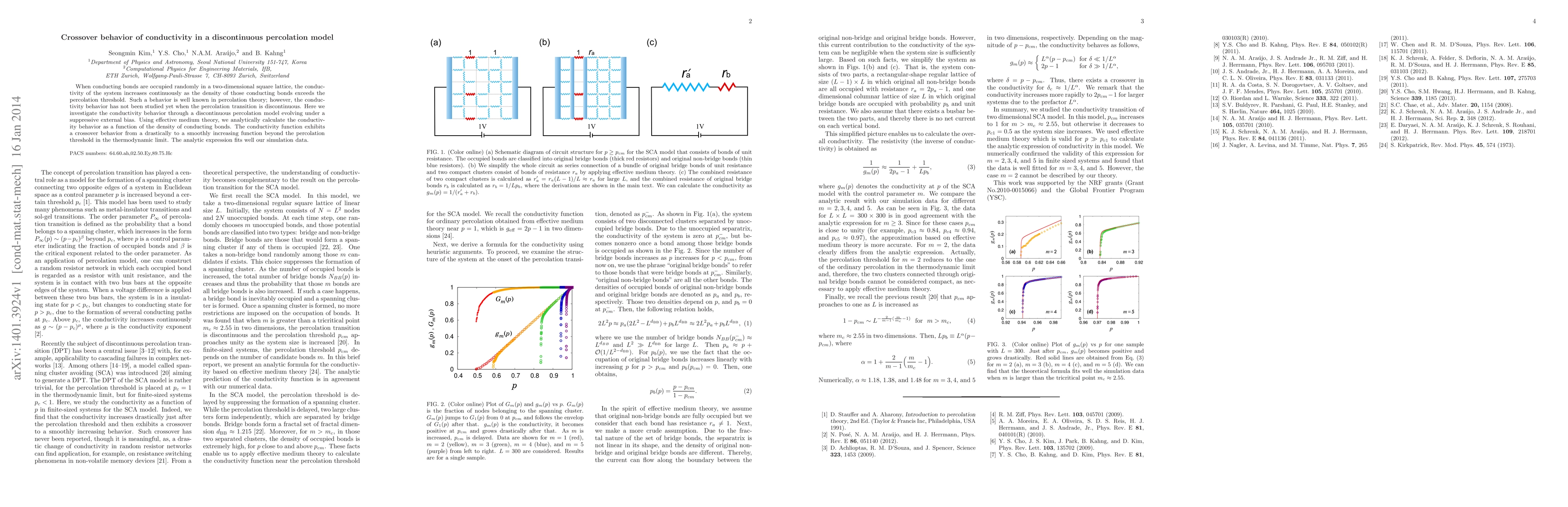 This paper investigates the conductivity behavior in a discontinuous percolation model on a two-dimensional square lattice, revealing that conductivity transitions from a sharp to a gradual increase beyond the percolation threshold. Analytical calculations using effective medium theory match the simulation data, showing a crossover in conductivity behavior.