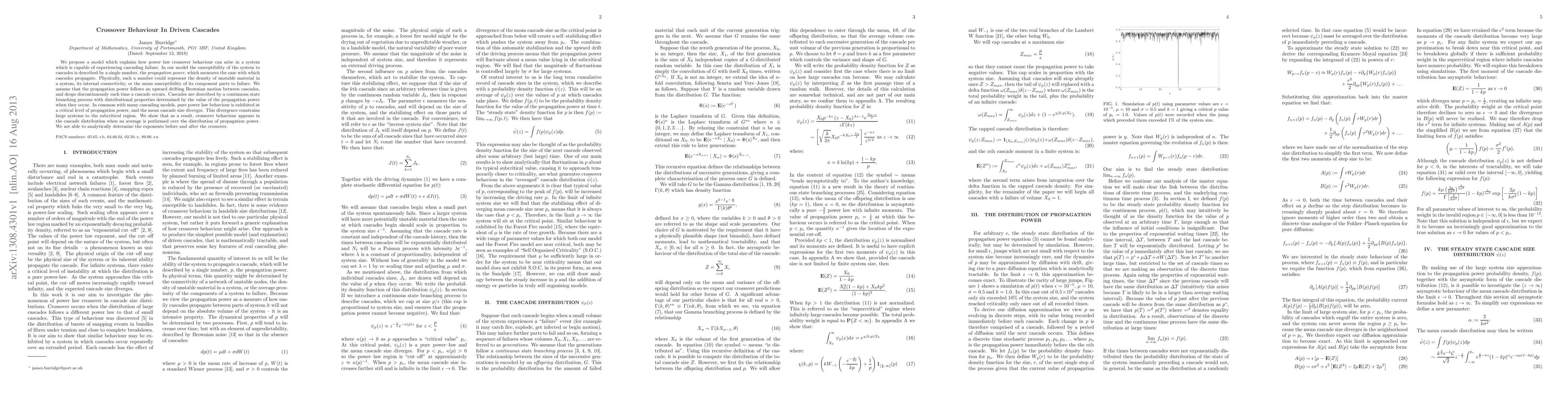 We propose a model which explains how power-law crossover behaviour can arise in a system which is capable of experiencing cascading failure. In our model the susceptibility of the system to cascades is described by a single number, the propagation power, which measures the ease with which cascades propagate. Physically, such a number could represent the density of unstable material in a system, its internal connectivity, or the mean susceptibility of its component parts to failure. We assume that the propagation power follows an upward drifting Brownian motion between cascades, and drops discontinuously each time a cascade occurs. Cascades are described by a continuous state branching process with distributional properties determined by the value of the propagation power when they occur. In common with many cascading models, pure power law behaviour is exhibited at a critical level of propagation power, and the mean cascade size diverges. This divergence constrains large systems to the subcritical region. We show that as a result, crossover behaviour appears in the cascade distribution when an average is performed over the distribution of propagation power. We are able to analytically determine the exponents before and after the crossover.
