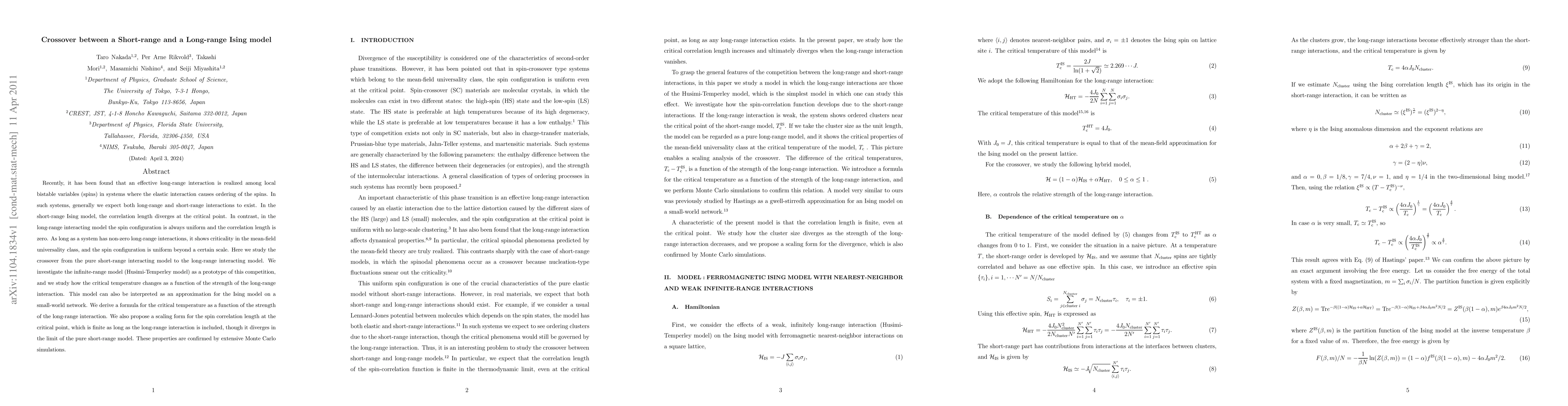This paper investigates the crossover between short-range and long-range interactions in the Ising model, focusing on the Husimi-Temperley model as a prototype. It derives a formula for the critical temperature based on the strength of long-range interactions and proposes a scaling form for the spin correlation length, confirmed by Monte Carlo simulations.