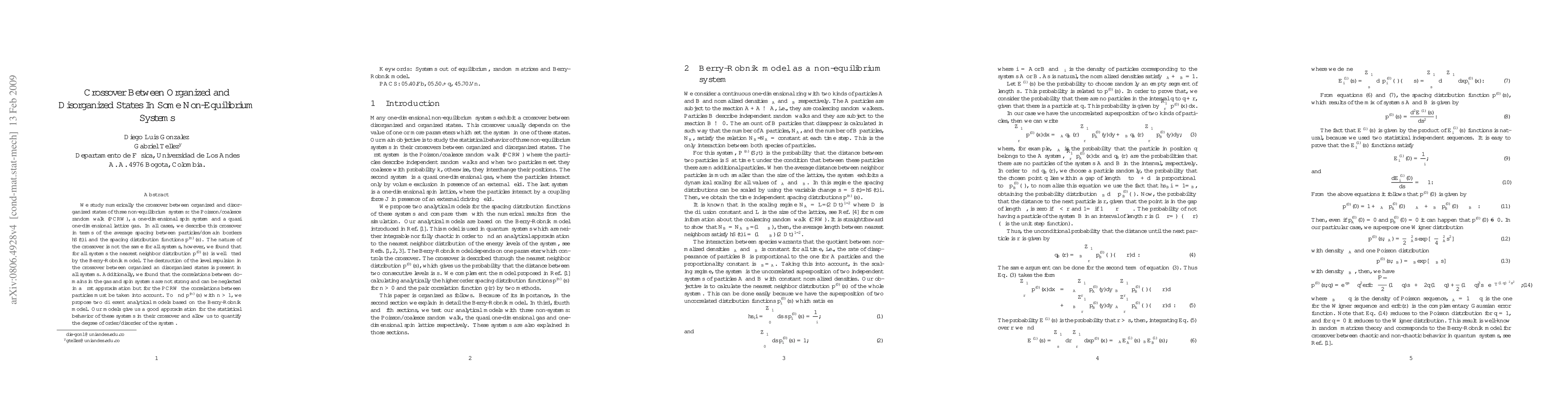 We study numerically the crossover between organized and disorganized states of three non-equilibrium systems: the Poisson/coalesce random walk (PCRW), a one-dimensional spin system and a quasi one-dimensional lattice gas. In all cases, we describe this crossover in terms of the average spacing between particles/domain borders $< S(t) >$ and the spacing distribution functions $p^{(n)}(s)$. The nature of the crossover is not the same for all systems, however, we found that for all systems the nearest neighbor distribution $p^{(0)}(s)$ is well fitted by the Berry-Robnik model. The destruction of the level repulsion in the crossover between organized an disorganized states is present in all systems. Additionally, we found that the correlations between domains in the gas and spin systems are not strong and can be neglected in a first approximation but for the PCRW the correlations between particles must be taken into account. To find $p^{(n)}(s)$ with $n>1$, we propose two different analytical models based on the Berry-Robnik model. Our models give us a good approximation for the statistical behavior of these systems in their crossover and allow us to quantify the degree of order/disorder of the system.