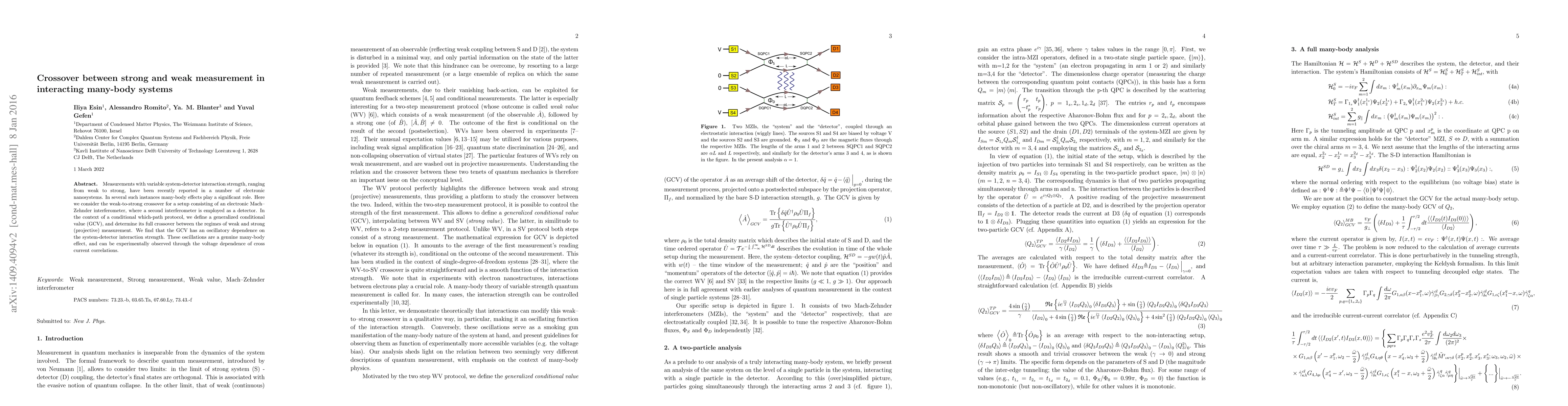 This paper investigates the crossover between weak and strong measurements in many-body electronic systems, specifically in an electronic Mach-Zehnder interferometer setup. The study finds that the generalized conditional value exhibits oscillatory behavior with system-detector interaction strength, revealing a genuine many-body effect observable via voltage-dependent cross current correlations.