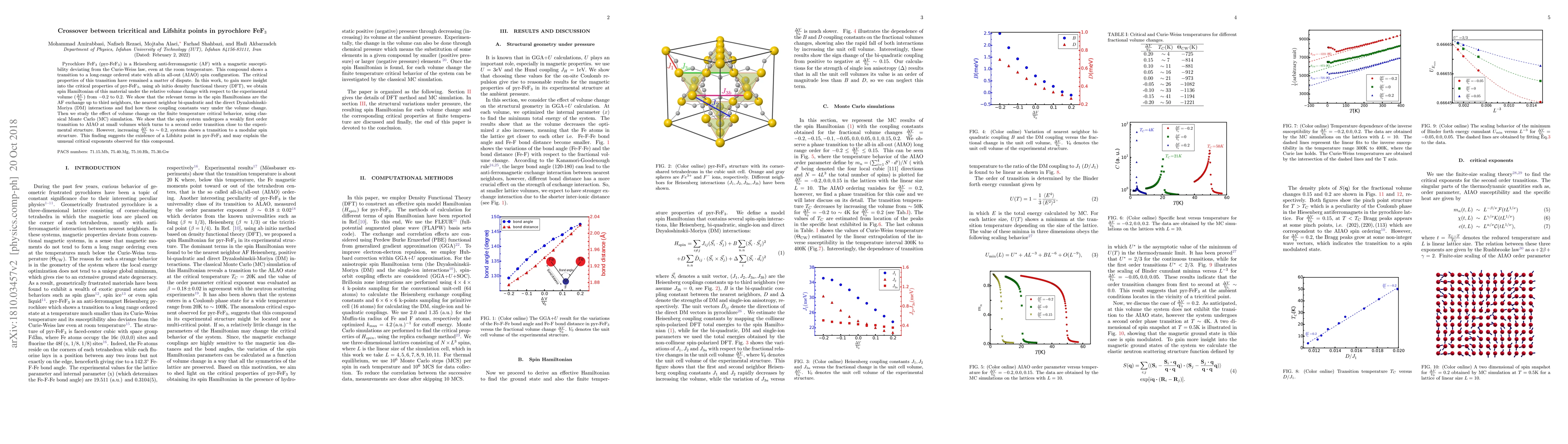 Pyrochlore FeF$_{3}$ (pyr-FeF$_{3}$) is a Heisenberg anti-ferromagnetic (AF) with a magnetic susceptibility deviating from the Curie-Weiss law, even at the room temperature. This compound shows a transition to a long-range ordered state with all-in all-out (AIAO) spin configuration. The critical properties of this transition have remained a matter of dispute. In this work, to gain more insight into the critical properties of pyr-FeF$_{3}$, using ab initio density functional theory (DFT), we obtain spin Hamiltonian of this material under the relative volume change with respect to the experimental volume ($\frac{\Delta V}{V_0}$) from $-0.2$ to $0.2$. We show that the relevant terms in the spin Hamiltonians are the AF exchange up to third neighbors, the nearest neighbor bi-quadratic and the direct Dyzaloshinski-Moriya (DM) interactions and find how these coupling constants vary under the volume change. Then we study the effect of volume change on the finite temperature critical behavior, using classical Monte Carlo (MC) simulation. We show that the spin system undergoes a weakly first order transition to AIAO at small volumes which turns to a second order transition close to the experimental structure. However, increasing $\frac{\Delta V}{V_0}$ to $\sim0.2$, systems shows a transition to a modular spin structure. This finding suggests the existence of a Lifshitz point in pyr-FeF$_{3}$ and may explain the unusual critical exponents observed for this compound.