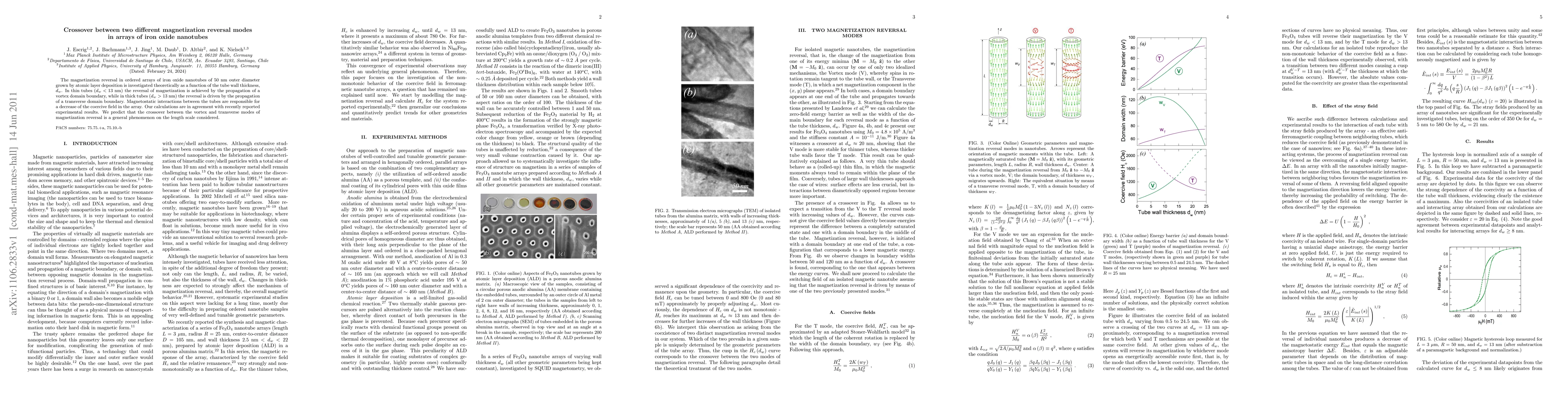 This paper investigates the magnetization reversal modes in arrays of iron oxide nanotubes, finding that thin tubes (<13 nm) exhibit vortex domain boundary reversal, while thicker tubes (>13 nm) show transverse domain boundary reversal. The study predicts a crossover in reversal mechanisms due to magnetostatic interactions.