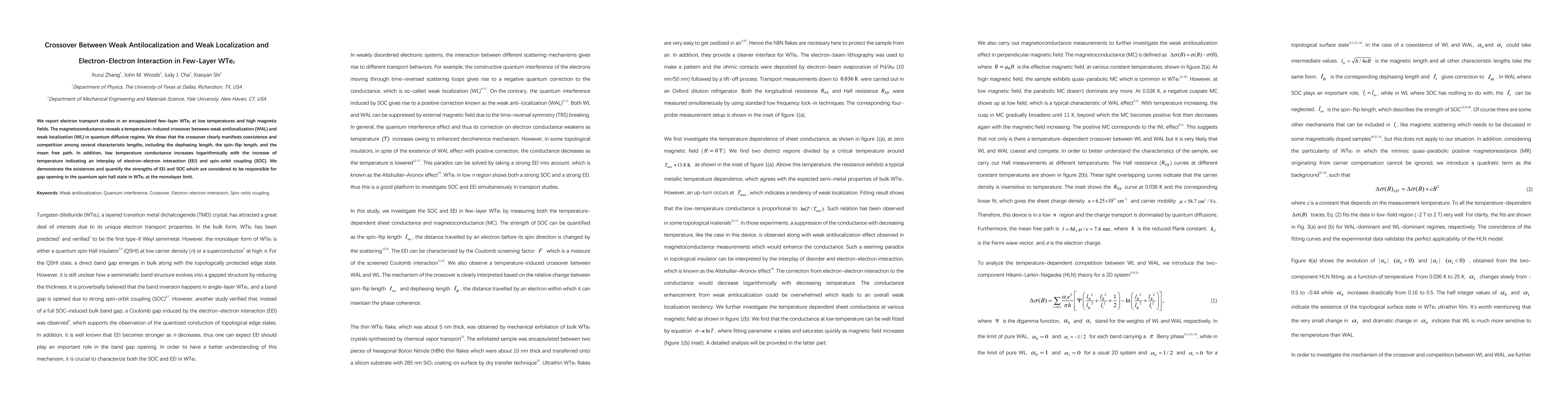This study investigates electron transport in few-layer WTe$_2$, revealing a temperature-induced crossover between weak antilocalization and weak localization, highlighting the interplay of dephasing, spin-flip, and mean free path lengths. Additionally, it shows logarithmic conductance increase with temperature, indicating electron-electron interaction and spin-orbit coupling's role in gap formation in WTe$_2$.