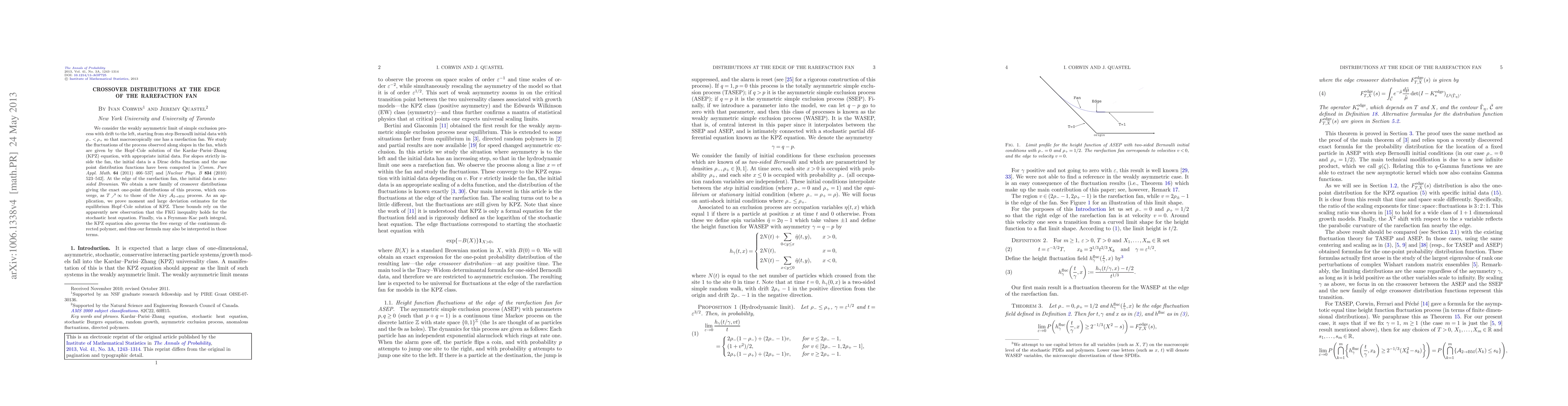 We consider the weakly asymmetric limit of simple exclusion process with drift to the left, starting from step Bernoulli initial data with $\rho_-<\rho_+$ so that macroscopically one has a rarefaction fan. We study the fluctuations of the process observed along slopes in the fan, which are given by the Hopf--Cole solution of the Kardar-Parisi-Zhang (KPZ) equation, with appropriate initial data. For slopes strictly inside the fan, the initial data is a Dirac delta function and the one point distribution functions have been computed in [Comm. Pure Appl. Math. 64 (2011) 466-537] and [Nuclear Phys. B 834 (2010) 523-542]. At the edge of the rarefaction fan, the initial data is one-sided Brownian. We obtain a new family of crossover distributions giving the exact one-point distributions of this process, which converge, as $T\nearrow\infty$ to those of the Airy $\mathcal{A}_{2\to \mathrm{BM}}$ process. As an application, we prove moment and large deviation estimates for the equilibrium Hopf-Cole solution of KPZ. These bounds rely on the apparently new observation that the FKG inequality holds for the stochastic heat equation. Finally, via a Feynman-Kac path integral, the KPZ equation also governs the free energy of the continuum directed polymer, and thus our formula may also be interpreted in those terms.