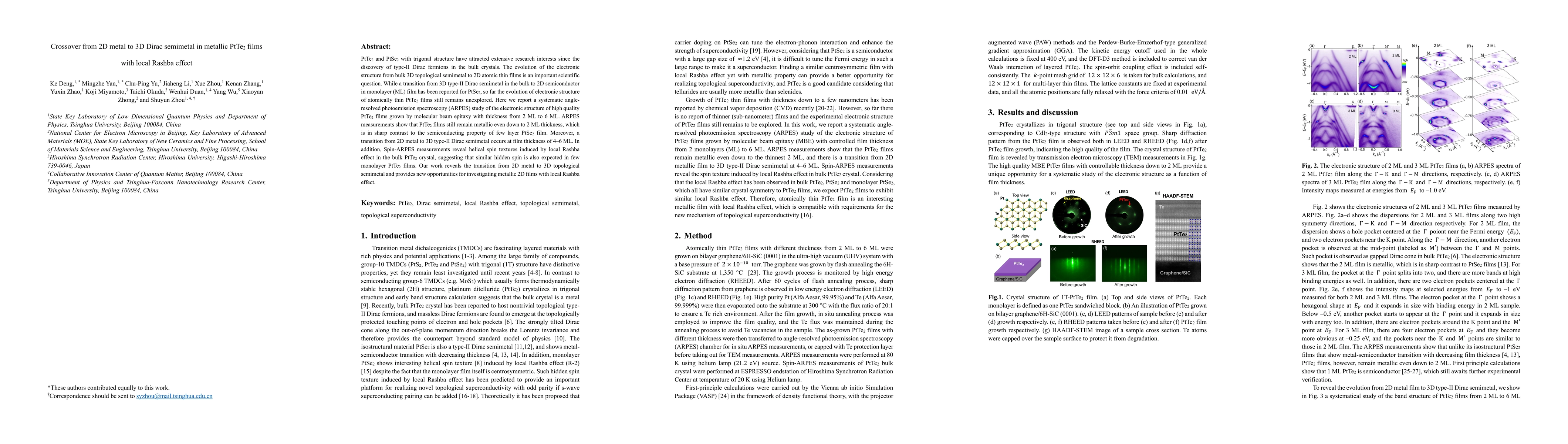 This paper reports an ARPES study on PtTe2 films, revealing that they remain metallic down to 2 ML, contrasting with the semiconducting few-layer PtSe2. A transition from 2D metal to 3D Dirac semimetal occurs at 4-6 ML thickness, with spin-ARPES indicating helical spin textures due to a local Rashba effect.
