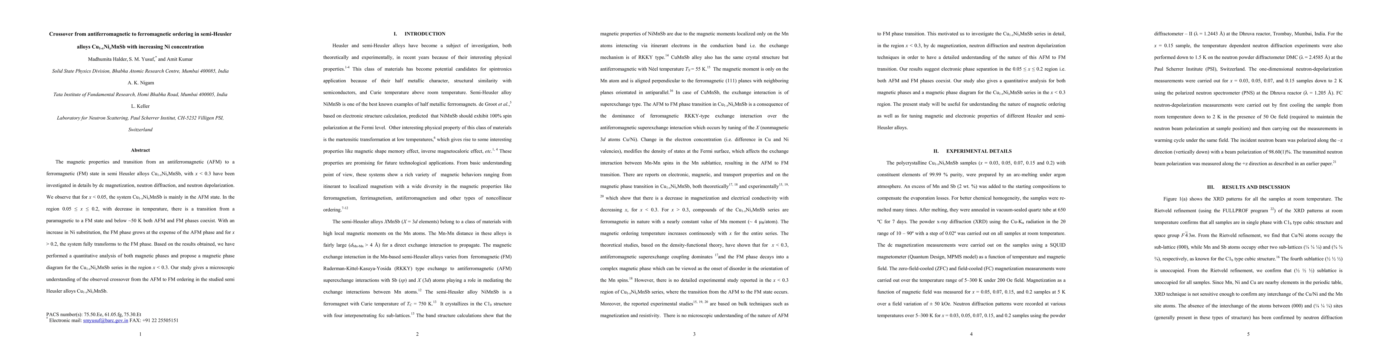 The magnetic properties and transition from an antiferromagnetic (AFM) to a ferromagnetic (FM) state in semi Heusler alloys Cu1-xNixMnSb, with x < 0.3 have been investigated in details by dc magnetization, neutron diffraction, and neutron depolarization. We observe that for x < 0.05, the system Cu1-xNixMnSb is mainly in the AFM state. In the region 0.05 \leq x \leq 0.2, with decrease in temperature, there is a transition from a paramagnetic to a FM state and below ~50 K both AFM and FM phases coexist. With an increase in Ni substitution, the FM phase grows at the expense of the AFM phase and for x > 0.2, the system fully transforms to the FM phase. Based on the results obtained, we have performed a quantitative analysis of both magnetic phases and propose a magnetic phase diagram for the Cu1-xNixMnSb series in the region x < 0.3. Our study gives a microscopic understanding of the observed crossover from the AFM to FM ordering in the studied semi Heusler alloys Cu1-xNixMnSb.