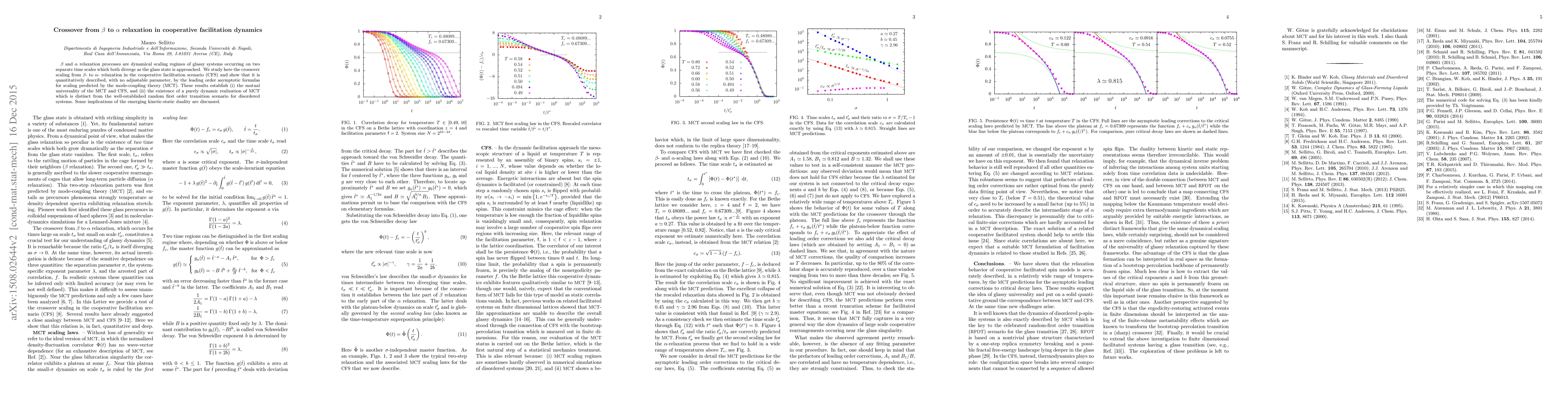 $\beta$ and $\alpha$ relaxation processes are dynamical scaling regimes of glassy systems occurring on two separate time scales which both diverge as the glass state is approached. We study here the crossover scaling from $\beta$- to $\alpha$- relaxation in the cooperative facilitation scenario (CFS) and show that it is quantitatively described, with no adjustable parameter, by the leading order asymptotic formulas for scaling predicted by the mode-coupling theory (MCT). These results establish: (i) the mutual universality of the MCT and CFS, and (ii) the existence of a purely dynamic realization of MCT which is distinct from the well established random-first order transition scenario for disordered systems. Some implications of the emerging kinetic-static duality are discussed.