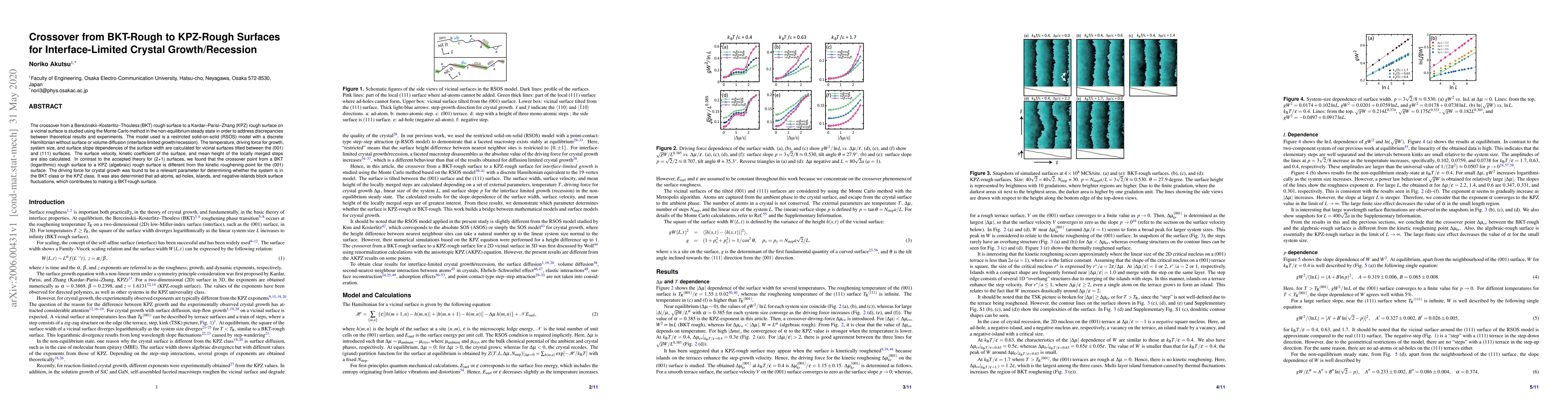 Researchers studied the crossover from BKT to KPZ rough surfaces in interface-limited crystal growth/recession using a Monte Carlo method, finding that ad-atoms block surface fluctuations and the driving force for growth determines whether the system is BKT or KPZ.