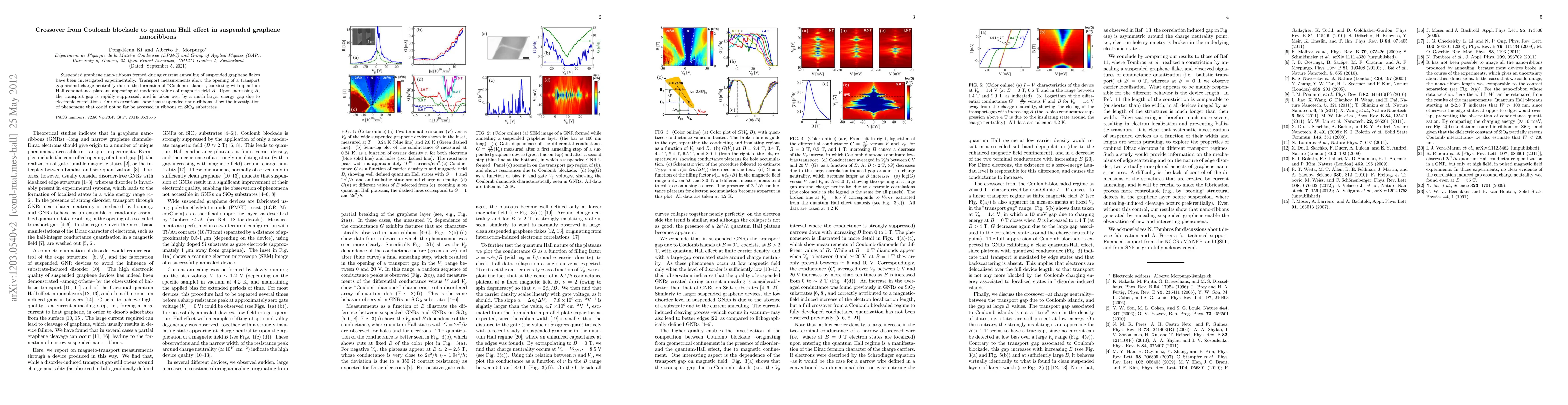 Suspended graphene nano-ribbons formed during current annealing of suspended graphene flakes have been investigated experimentally. Transport measurements show the opening of a transport gap around charge neutrality due to the formation of "Coulomb islands", coexisting with quantum Hall conductance plateaus appearing at moderate values of magnetic field $B$. Upon increasing $B$, the transport gap is rapidly suppressed, and is taken over by a much larger energy gap due to electronic correlations. Our observations show that suspended nano-ribbons allow the investigation of phenomena that could not so far be accessed in ribbons on SiO$_2$ substrates.