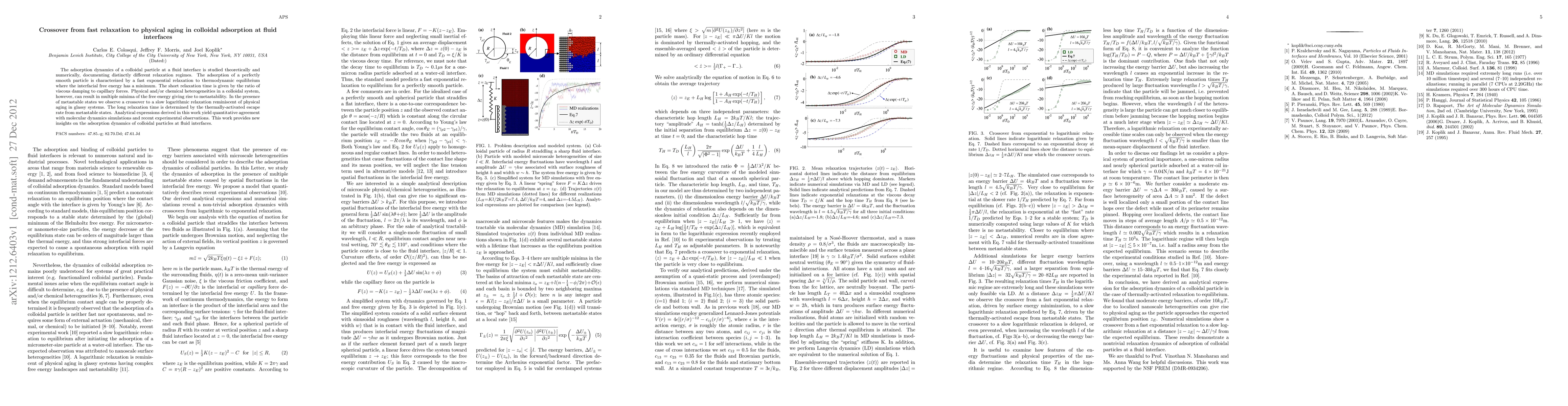This paper investigates the adsorption dynamics of colloidal particles at fluid interfaces, identifying fast exponential relaxation for smooth particles and slow logarithmic relaxation due to metastable states caused by heterogeneities. Analytical expressions match simulation results and experimental observations, offering new insights into colloidal adsorption dynamics.