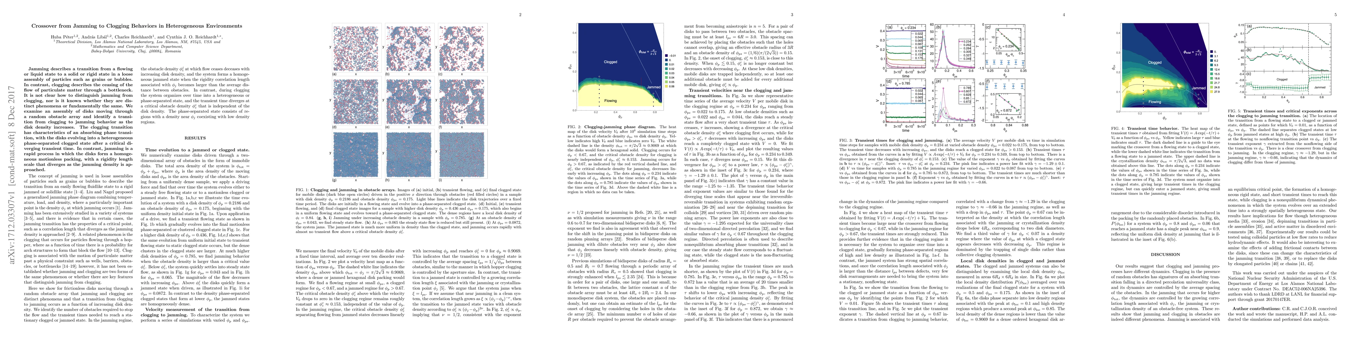 This study investigates the transition between jamming and clogging behaviors in particle assemblies moving through random obstacles, identifying a shift from clogging to jamming as disk density increases. The clogging phase exhibits characteristics of an absorbing phase transition, while jamming results in a rapid, homogeneous rigid packing.