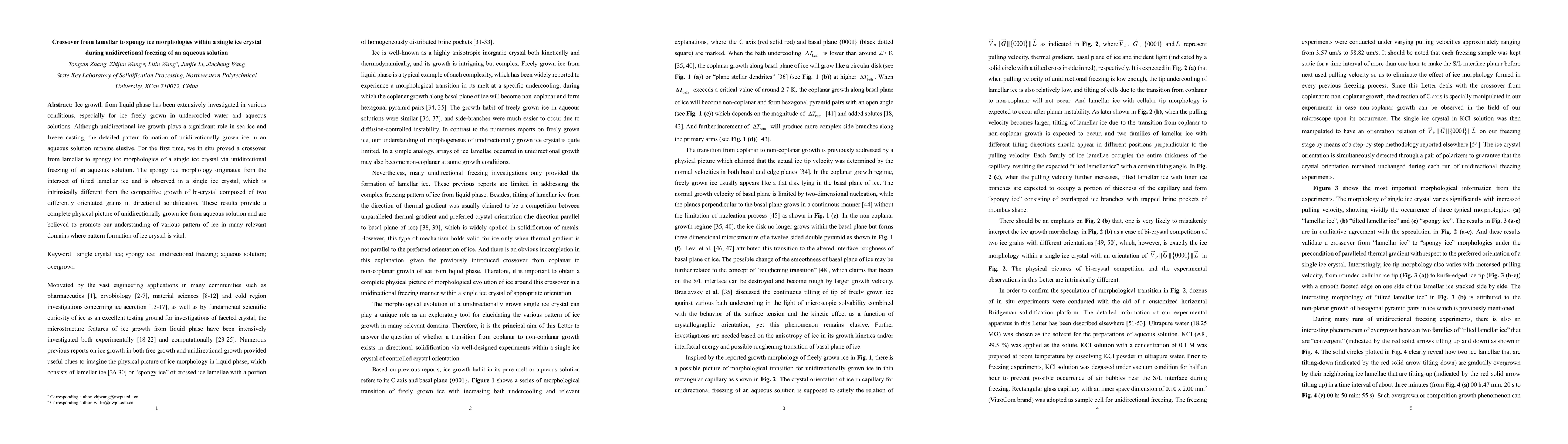 This work is novel as it first demonstrates the crossover from lamellar to spongy ice morphologies within a single crystal under unidirectional freezing of an aqueous solution, distinct from bi-crystal competitive growth.