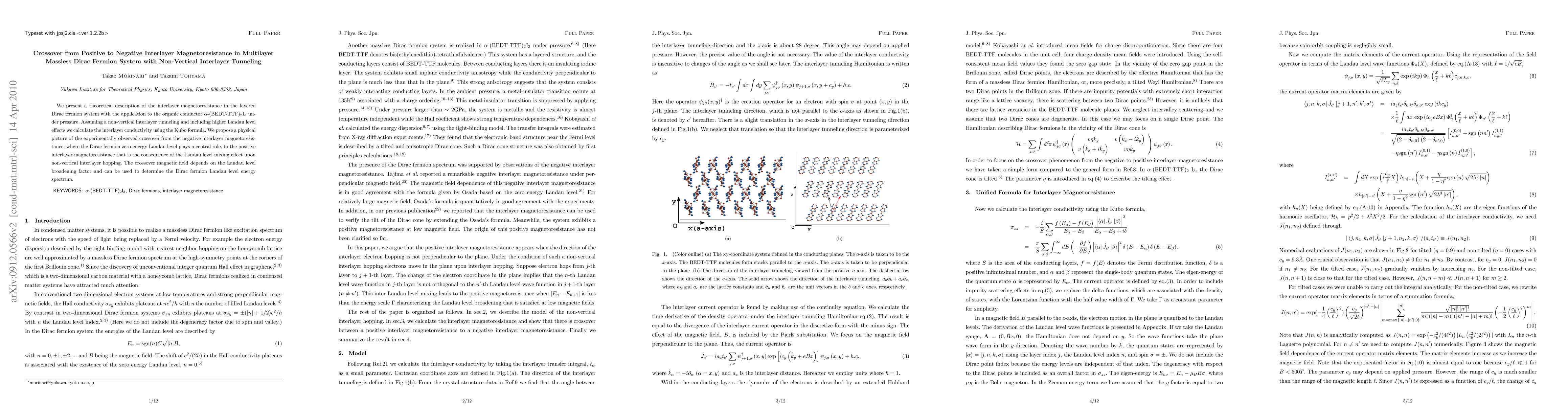 This research explores the interlayer magnetoresistance in a layered Dirac fermion system under pressure, proposing a theoretical framework that explains the crossover from negative to positive magnetoresistance due to non-vertical interlayer tunneling and higher Landau level effects. The study suggests this crossover can determine the Dirac fermion Landau level energy spectrum.