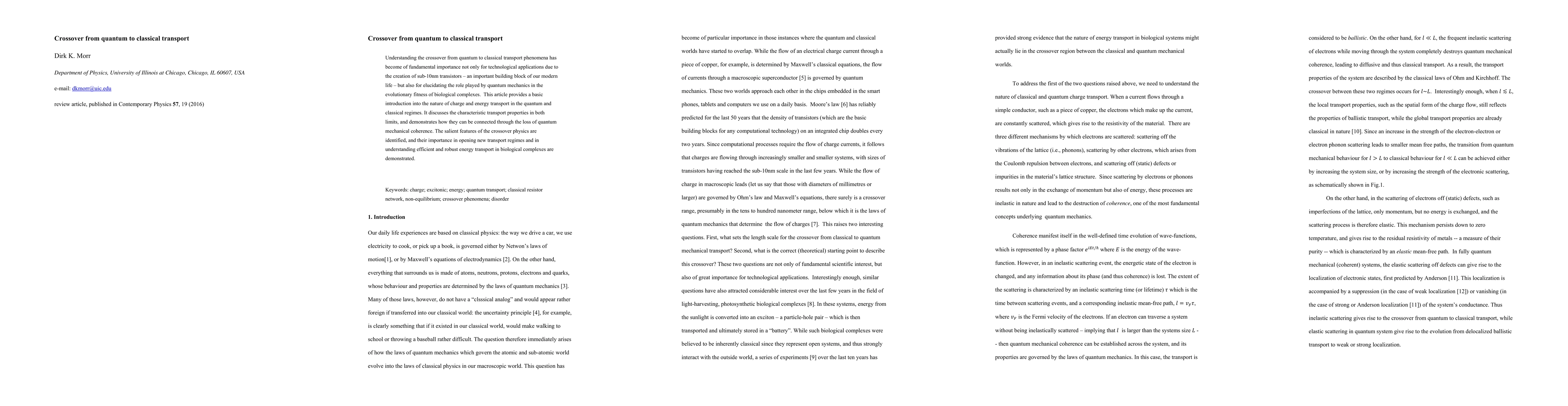 This paper explores the transition from quantum to classical transport phenomena, crucial for sub-10nm transistor technology and for understanding biological energy transport. It examines the distinct transport properties in quantum and classical regimes and highlights the significance of coherence loss in bridging these regimes.