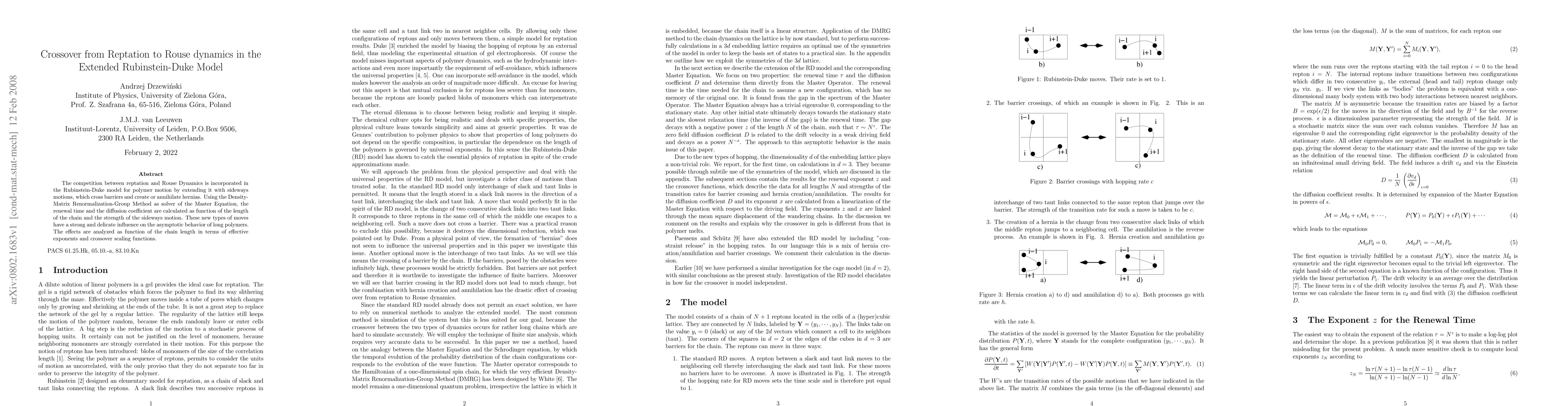 This paper investigates the transition between reptation and Rouse dynamics in the extended Rubinstein-Duke model by incorporating sideways motions that create or annihilate hernias. Using the Density-Matrix Renormalization-Group Method, it calculates the renewal time and diffusion coefficient, revealing significant effects on the asymptotic behavior of long polymers through effective exponents and crossover scaling functions.
