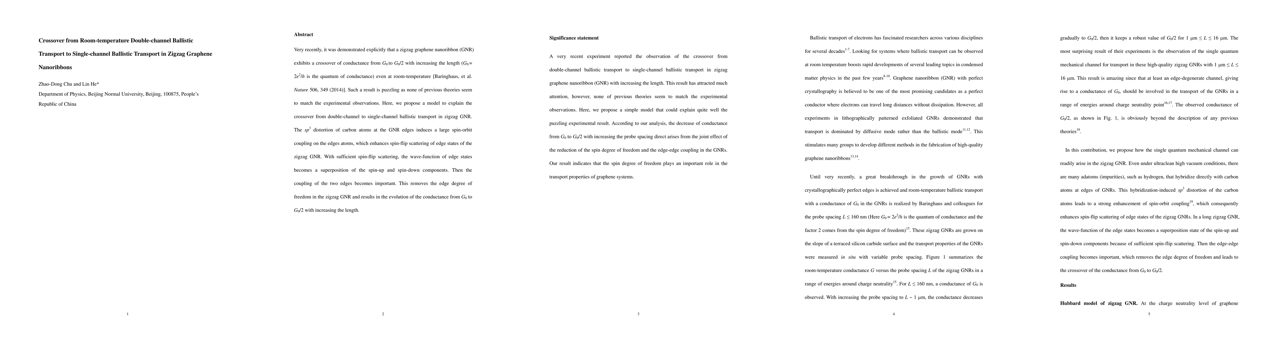 Very recently, it was demonstrated explicitly that a zigzag graphene nanoribbon (GNR) exhibits a crossover of conductance from G0 to G0/2 with increasing the length (G0 = 2e2/h is the quantum of conductance) even at room-temperature [Baringhaus, et al. Nature 506, 349 (2014)]. Such a result is puzzling as none of previous theories seem to match the experimental observations. Here, we propose a model to explain the crossover from double-channel to single-channel ballistic transport in zigzag GNR. The sp3 distortion of carbon atoms at the GNR edges induces a large spin-orbit coupling on the edges atoms, which enhances spin-flip scattering of edge states of the zigzag GNR. With sufficient spin-flip scattering, the wave-function of edge states becomes a superposition of the spin-up and spin-down components. Then the coupling of the two edges becomes important. This removes the edge degree of freedom in the zigzag GNR and results in the evolution of the conductance from G0 to G0/2 with increasing the length.