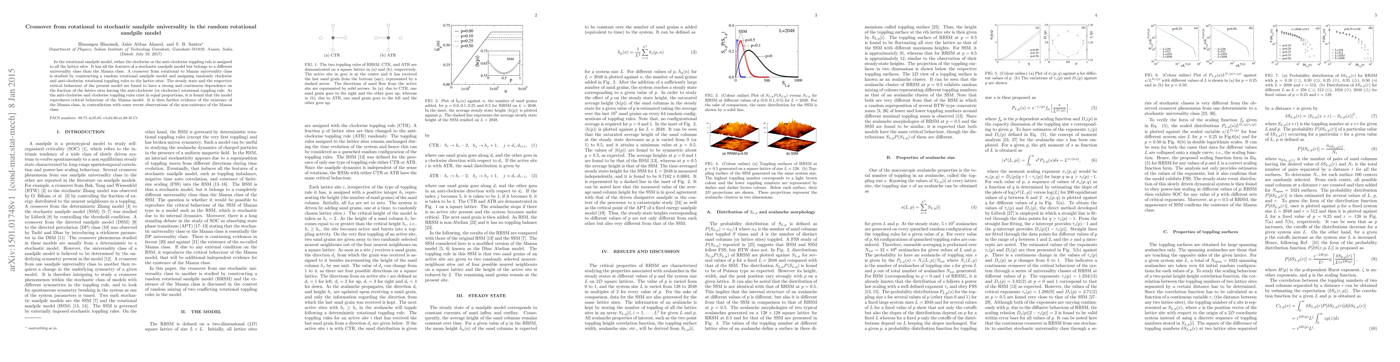 In the rotational sandpile model, either the clockwise or the anti-clockwise toppling rule is assigned to all the lattice sites. It has all the features of a stochastic sandpile model but belongs to a different universality class than the Manna class. A crossover from rotational to Manna universality class is studied by constructing a random rotational sandpile model and assigning randomly clockwise and anti-clockwise rotational toppling rules to the lattice sites. The steady state and the respective critical behaviour of the present model are found to have a strong and continuous dependence on the fraction of the lattice sites having the anti-clockwise (or clockwise) rotational toppling rule. As the anti-clockwise and clockwise toppling rules exist in equal proportions, it is found that the model reproduces critical behaviour of the Manna model. It is then further evidence of the existence of the Manna class, in contradiction with some recent observations of the non-existence of the Manna class.
