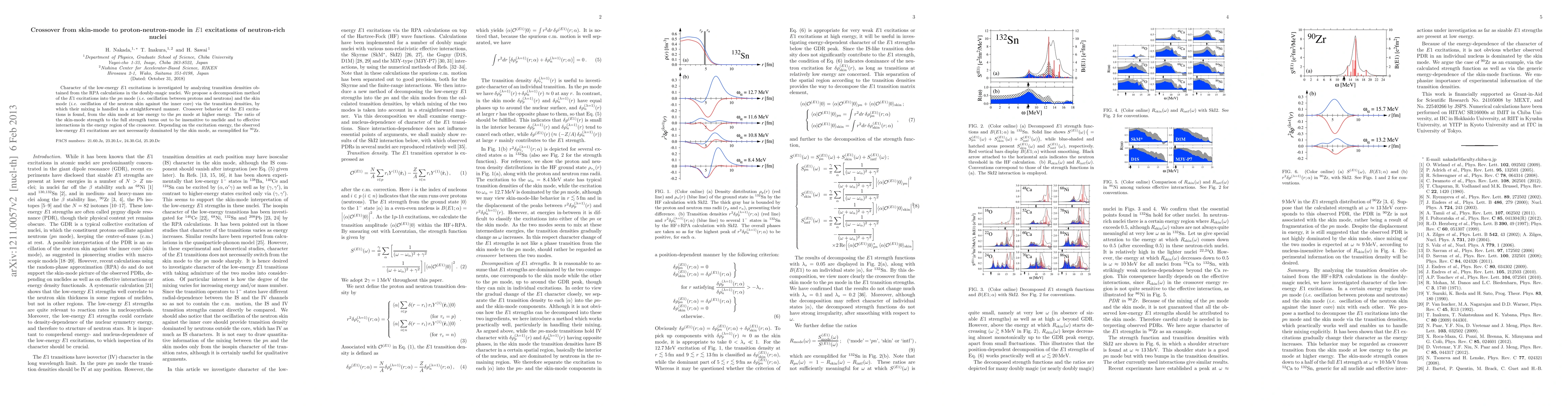 Character of the low-energy $E1$ excitations is investigated by analyzing transition densities obtained from the RPA calculations in the doubly-magic nuclei. We propose a decomposition method of the $E1$ excitations into the $pn$ mode (i.e. oscillation between protons and neutrons) and the skin mode (oscillation of the neutron skin against the inner core) via the transition densities, by which their mixing is handled in a straightforward manner. Crossover behavior of the $E1$ excitations is found, from the skin mode at low energy to the $pn$ mode at higher energy. The ratio of the skin-mode strength to the full strength turns out to be insensitive to nuclide and to effective interactions in the energy region of the crossover. Depending on the excitation energy, the observed low-energy $E1$ excitations are not necessarily dominated by the skin mode, as exemplified for $^{90}$Zr. fied for $^{90}$Zr.