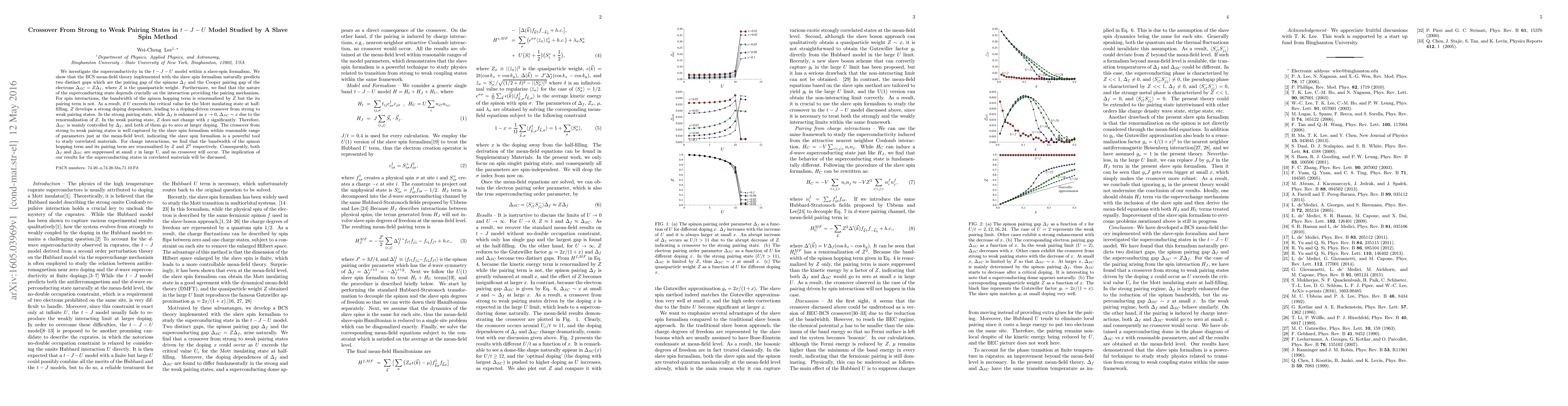This paper uses a slave-spin method to study superconductivity in the $t-J-U$ model, revealing a crossover from strong to weak pairing states driven by doping. The slave spin formalism predicts two distinct gaps, and the nature of the superconducting state depends on the interaction type, leading to different behaviors for spin and charge interactions.