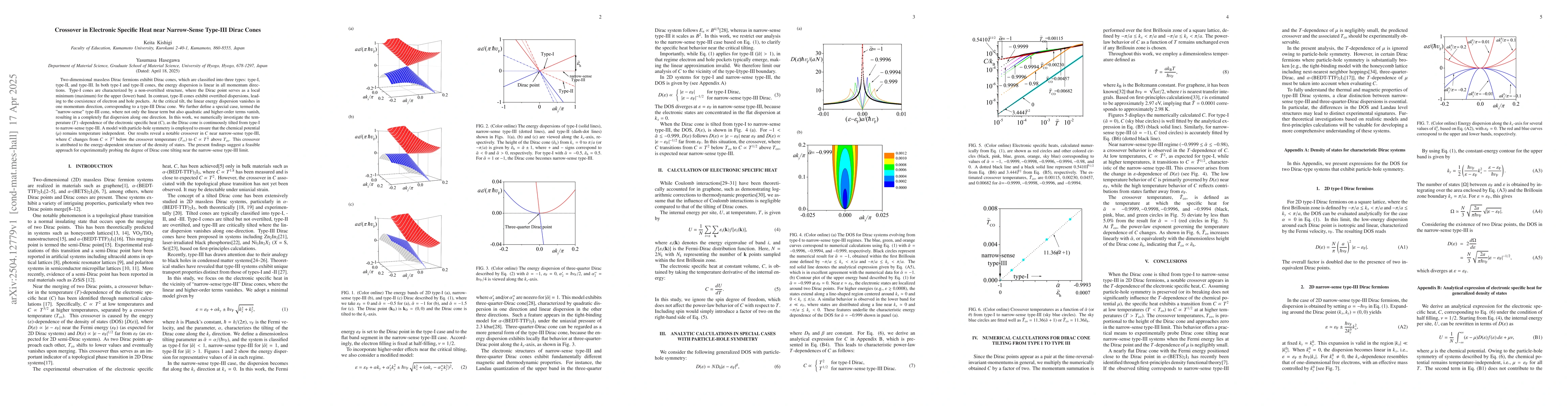 The paper presents a numerical model and analysis of the electronic specific heat's temperature dependence near narrow-sense type-III Dirac cones, revealing a crossover behavior from $C \propto T^{2}$ to $C \propto T^{\frac{1}{2}}$, attributed to the energy-dependent density of states.