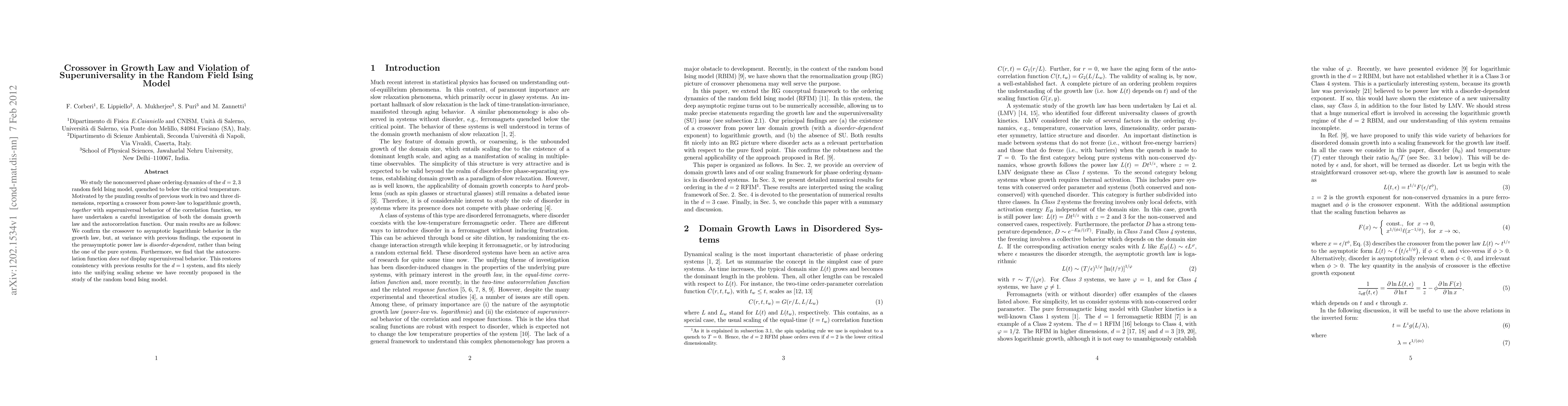 The research paper investigates the growth law and autocorrelation function of the 2D and 3D random field Ising model, finding a crossover to logarithmic behavior but not superuniversal behavior as previously thought.