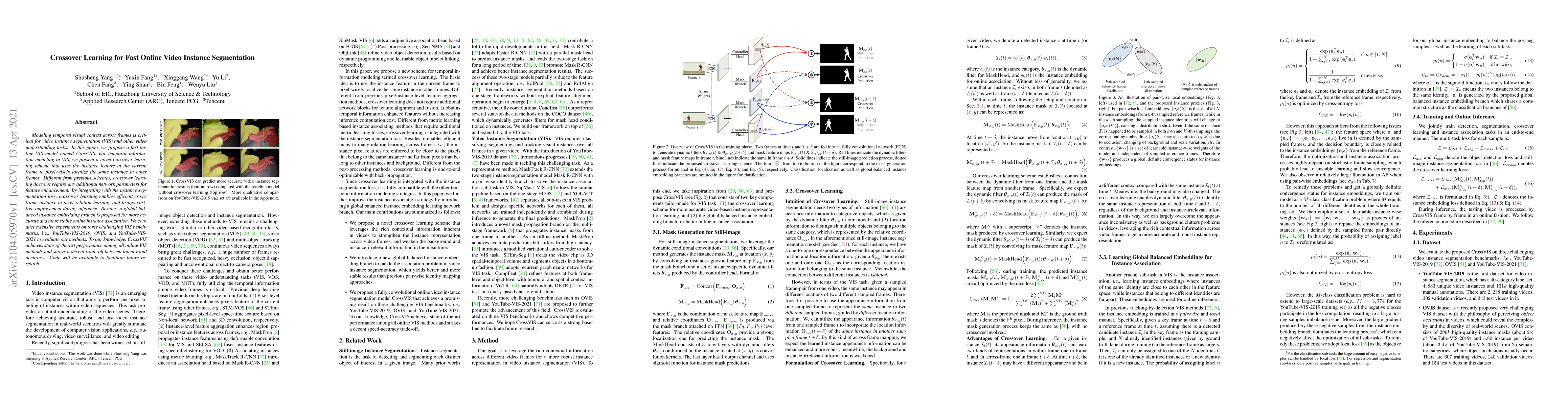 This paper introduces CrossVIS, a fast online video instance segmentation model utilizing a novel crossover learning scheme for efficient cross-frame instance-to-pixel relation learning without additional network parameters. The method achieves state-of-the-art performance on three benchmarks, balancing latency and accuracy effectively.