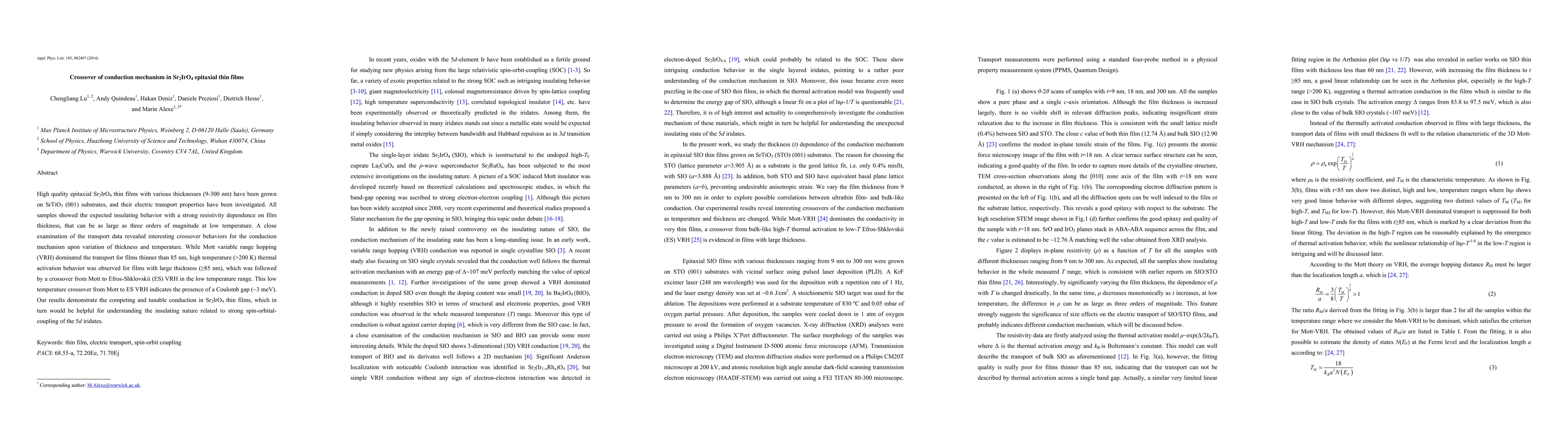 This study investigates the conduction mechanisms in epitaxial Sr2IrO4 thin films, revealing a thickness-dependent crossover from Mott variable range hopping to Efros-Shklovskii variable range hopping, indicating a Coulomb gap and tunable insulating behavior. The findings highlight the complex interplay of conduction mechanisms in 5d iridates.