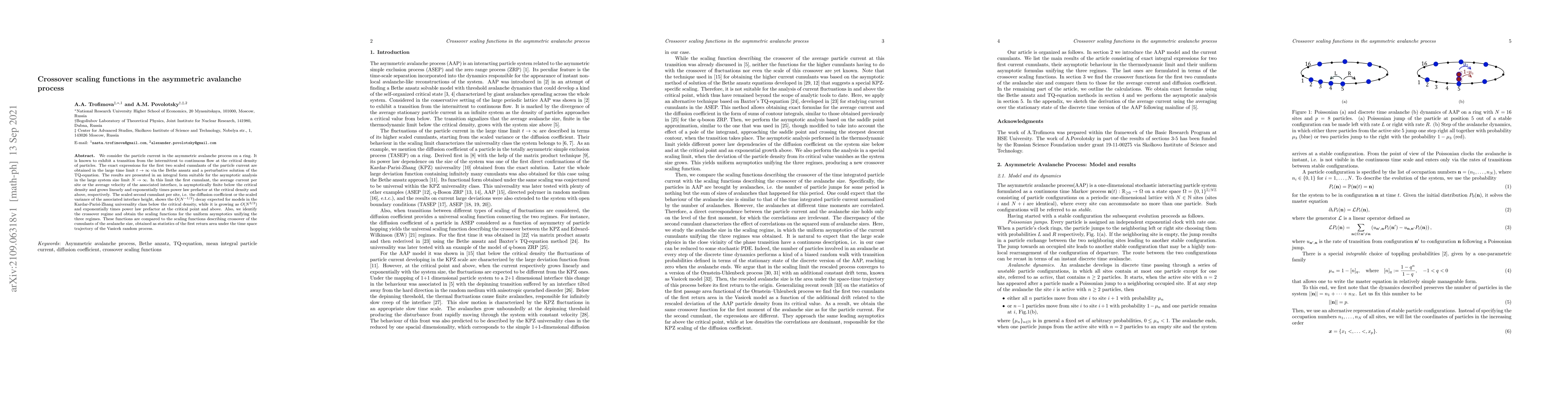 We consider the particle current in the asymmetric avalanche process on a ring. It is known to exhibit a transition from the intermittent to continuous flow at the critical density of particles. The exact expressions for the first two scaled cumulants of the particle current are obtained in the large time limit $t\to\infty$ via the Bethe ansatz and a perturbative solution of the TQ-equation. The results are presented in an integral form suitable for the asymptotic analysis in the large system size limit $N\to\infty$. In this limit the first cumulant, the average current per site or the average velocity of the associated interface, is asymptotically finite below the critical density and grows linearly and exponentially times power law prefactor at the critical density and above, respectively. The scaled second cumulant per site, i.e. the diffusion coefficient or the scaled variance of the associated interface height, shows the $O(N^{-1/2})$ decay expected for models in the Kardar-Parisi-Zhang universality class below the critical density, while it is growing as $O(N^{3/2})$ and exponentially times power law prefactor at the critical point and above. Also, we identify the crossover regime and obtain the scaling functions for the uniform asymptotics unifying the three regimes. These functions are compared to the scaling functions describing crossover of the cumulants of the avalanche size, obtained as statistics of the first return area under the time space trajectory of the Vasicek random process.