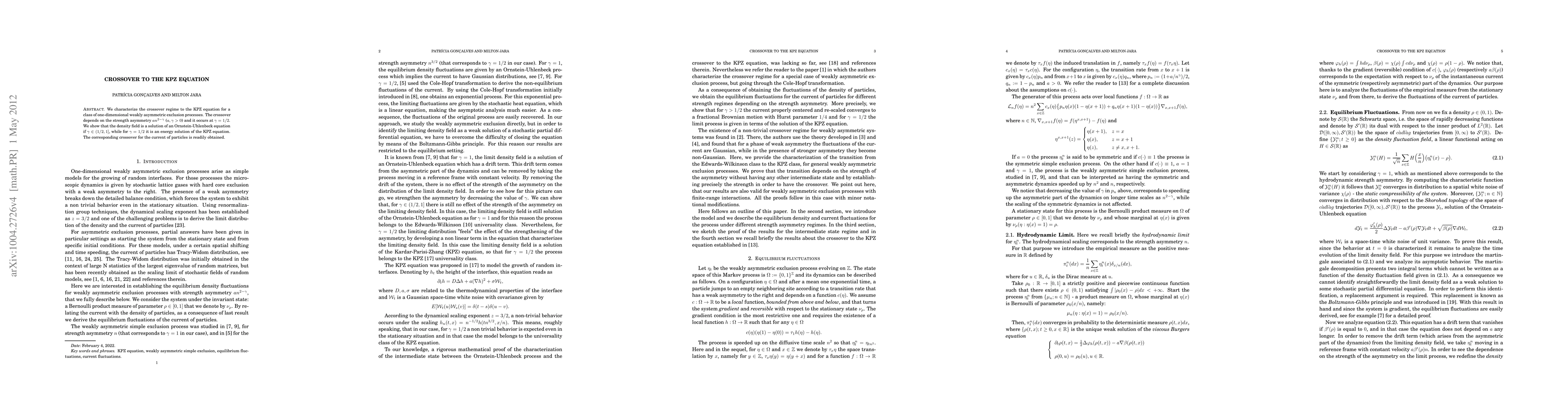 This paper investigates the crossover behavior of one-dimensional weakly asymmetric exclusion processes to the KPZ equation, showing that the density field follows an Ornstein-Uhlenbeck equation for $\gamma \in (1/2, 1]$ and the KPZ equation for $\gamma = 1/2$. The current crossover is also discussed.