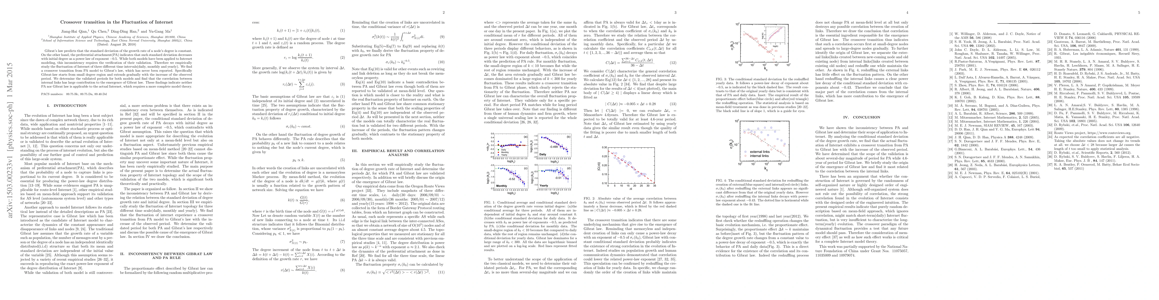 The study found a crossover transition from preferential attachment to Gibrat's law in internet fluctuation, suggesting neither model is fully applicable to the actual internet, highlighting the need for a more complete model theory.