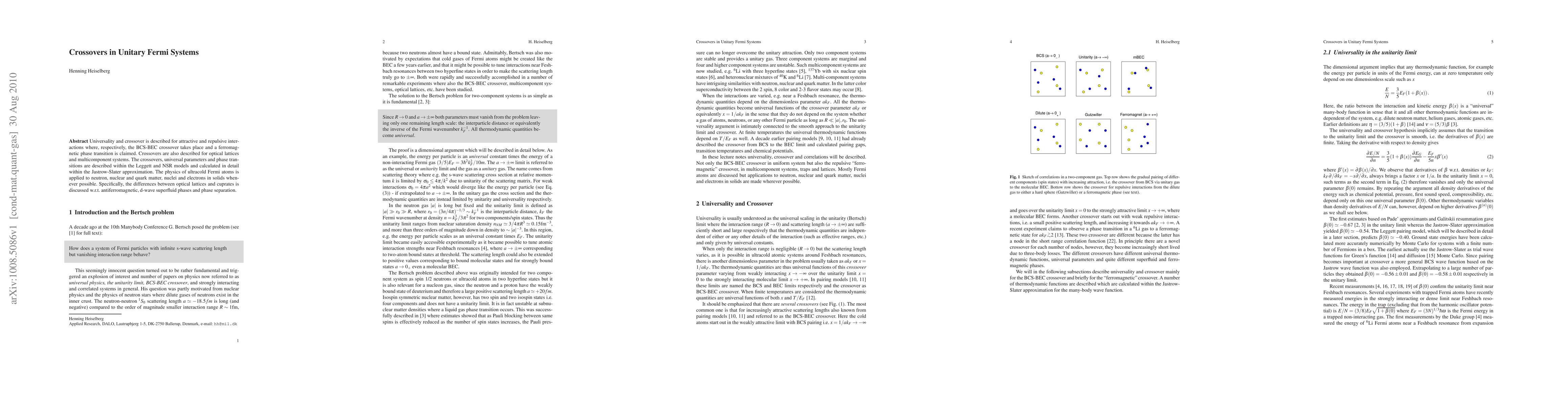 Universality and crossover is described for attractive and repulsive interactions where, respectively, the BCS-BEC crossover takes place and a ferromagnetic phase transition is claimed. Crossovers are also described for optical lattices and multicomponent systems. The crossovers, universal parameters and phase transitions are described within the Leggett and NSR models and calculated in detail within the Jastrow-Slater approximation. The physics of ultracold Fermi atoms is applied to neutron, nuclear and quark matter, nuclei and electrons in solids whenever possible. Specifically, the differences between optical lattices and cuprates is discussed w.r.t. antiferromagnetic, d-wave superfluid phases and phase separation.