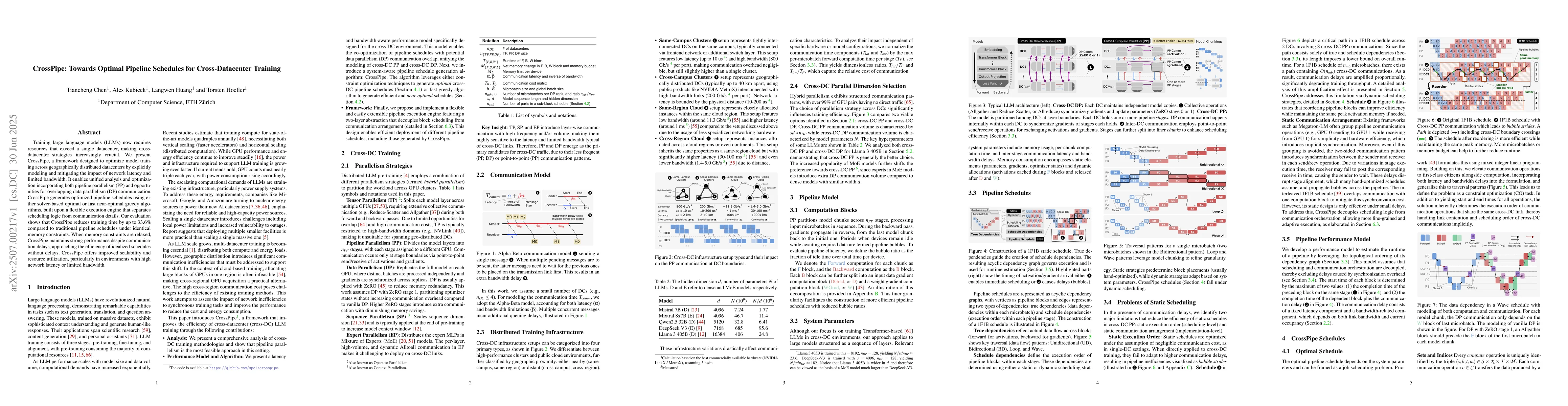 CrossPipe is a framework optimizing large language model training across datacenters by minimizing network latency and bandwidth limitations. It reduces training time by up to 33.6% compared to traditional methods and offers improved scalability and resource utilization, especially in high-latency or low-bandwidth environments.