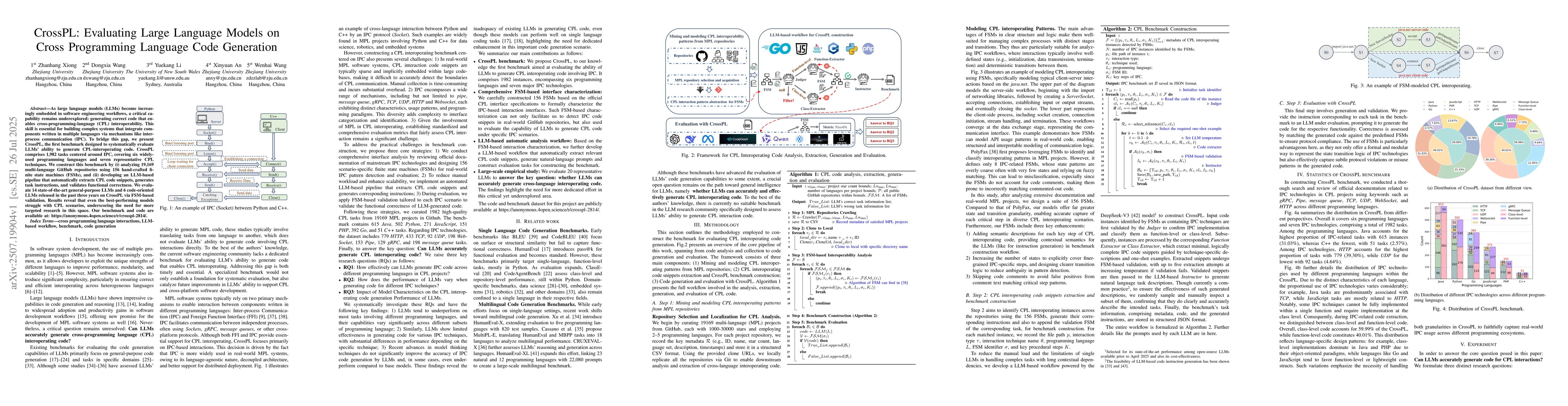 As large language models (LLMs) become increasingly embedded in software engineering workflows, a critical capability remains underexplored: generating correct code that enables cross-programming-language (CPL) interoperability. This skill is essential for building complex systems that integrate components written in multiple languages via mechanisms like inter-process communication (IPC). To bridge this gap, we present CrossPL, the first benchmark designed to systematically evaluate LLMs' ability to generate CPL-interoperating code. CrossPL comprises 1,982 tasks centered around IPC, covering six widely-used programming languages and seven representative CPL techniques. We construct this benchmark by (i) analyzing 19,169 multi-language GitHub repositories using 156 hand-crafted finite state machines (FSMs), and (ii) developing an LLM-based pipeline that automatically extracts CPL code snippets, generates task instructions, and validates functional correctness. We evaluate 14 state-of-the-art general-purpose LLMs and 6 code-oriented LLMs released in the past three years on CrossPL via FSM-based validation. Results reveal that even the best-performing models struggle with CPL scenarios, underscoring the need for more targeted research in this space. Our benchmark and code are available at: https://anonymous.4open.science/r/crosspl-2814.