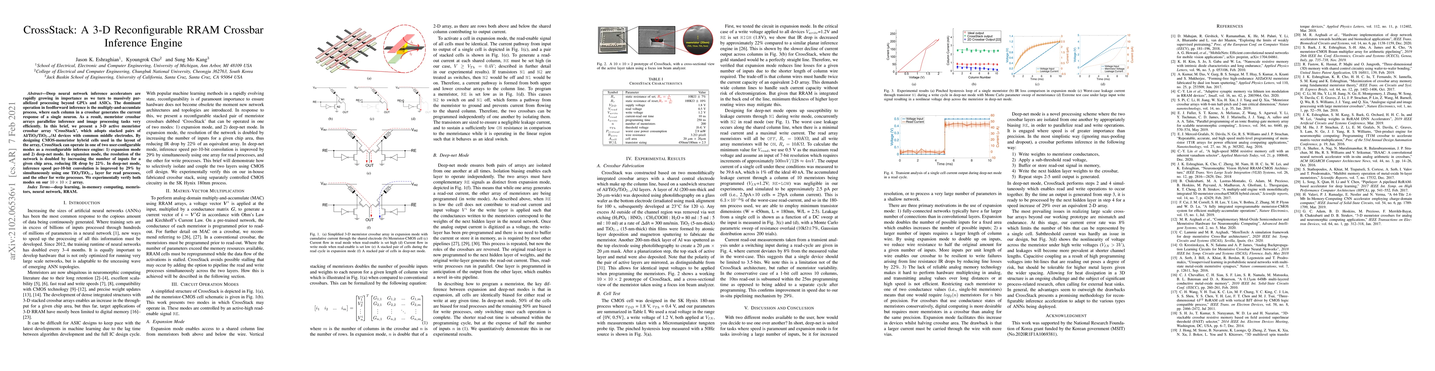 CrossStack is a 3-D reconfigurable RRAM crossbar designed for efficient deep neural network inference, offering two modes: expansion mode for doubled resolution and reduced IR drop, and deep-net mode for improved inference speed via simultaneous read and write processes. Experimental results demonstrate significant performance enhancements in both modes.