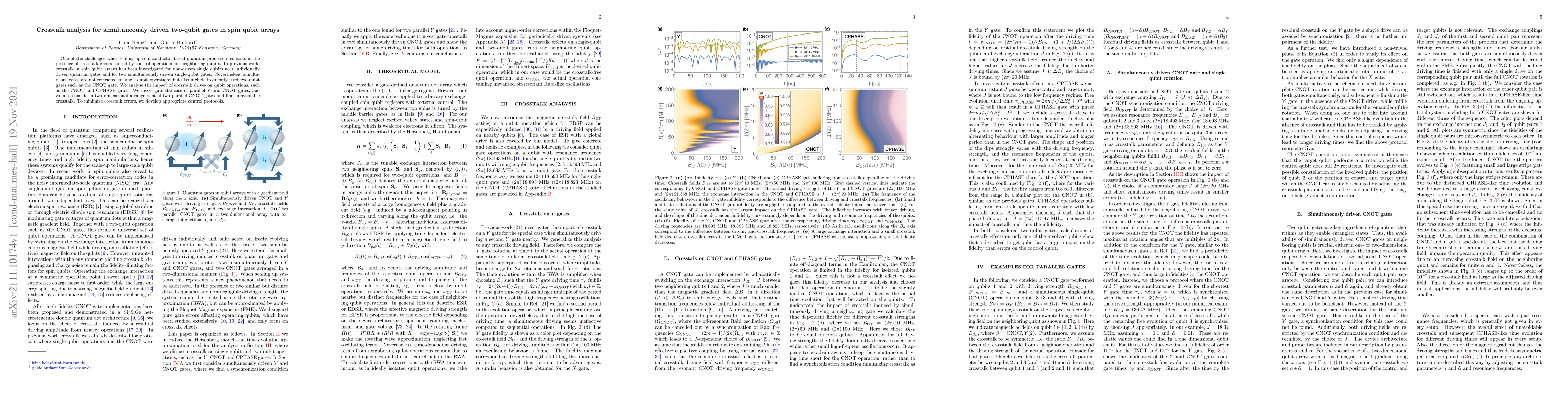 This paper investigates crosstalk errors in spin qubit arrays during simultaneous control operations, particularly focusing on two-qubit gates like CNOT and CPHASE. It identifies unavoidable crosstalk in parallel $Y$ and CNOT gates and proposes control protocols to minimize these errors.