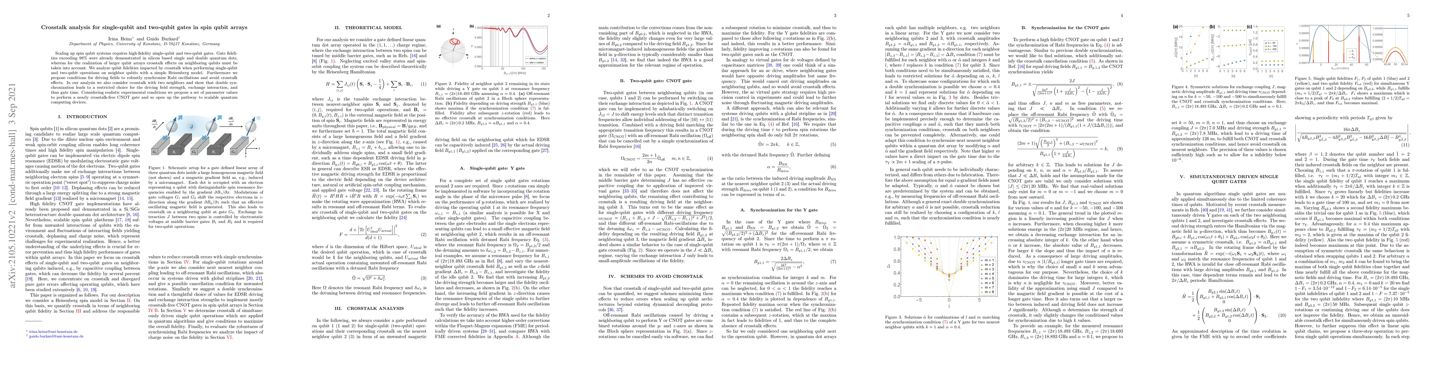 Scaling up spin qubit systems requires high-fidelity single-qubit and two-qubit gates. Gate fidelities exceeding $98\%$ were already demonstrated in silicon based single and double quantum dots, whereas for the realization of larger qubit arrays crosstalk effects on neighboring qubits must be taken into account. We analyze qubit fidelities impacted by crosstalk when performing single-qubit and two-qubit operations on neighbor qubits with a simple Heisenberg model. Furthermore we propose conditions for driving fields to robustly synchronize Rabi oscillations and avoid crosstalk effects. In our analysis we also consider next to nearest neighbor crosstalk and show that double synchronization leads to a restricted choice for the driving field strength, exchange interaction, and thus gate time. Considering realistic experimental conditions we propose a set of parameter values to perform a nearly crosstalk-free CNOT gate and so open up the pathway to scalable quantum computing devices.