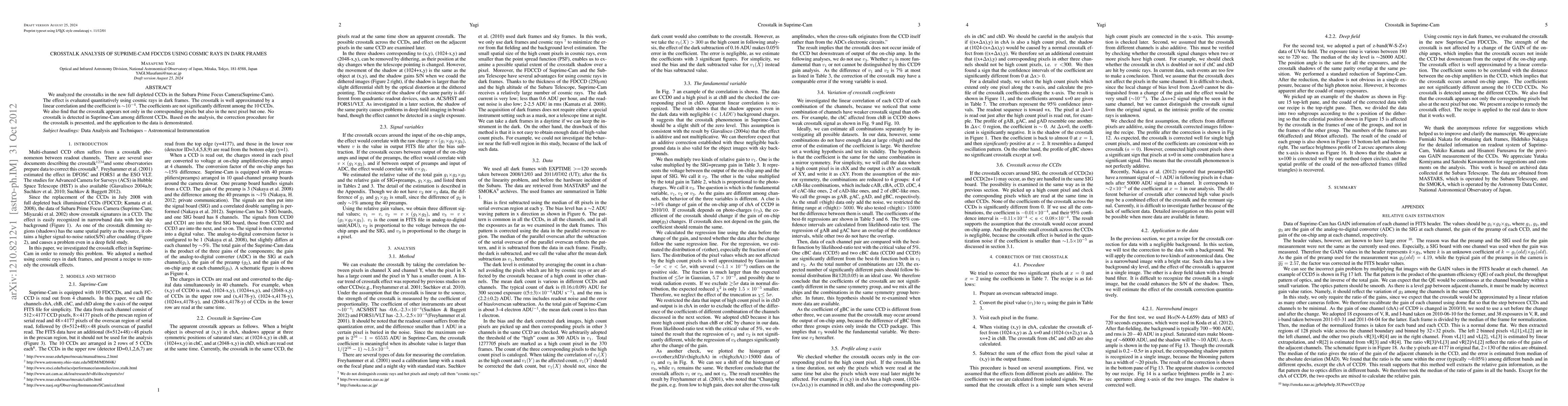 This study quantifies crosstalk in Subaru Prime Focus Camera's full-depleted CCDs using cosmic rays in dark frames, finding a linear correlation with a coefficient of ~10^-4. The crosstalk is consistent across 10 CCDs and occurs in adjacent pixels, but no crosstalk is detected between different CCDs. A correction procedure is proposed and demonstrated for mitigating this crosstalk.