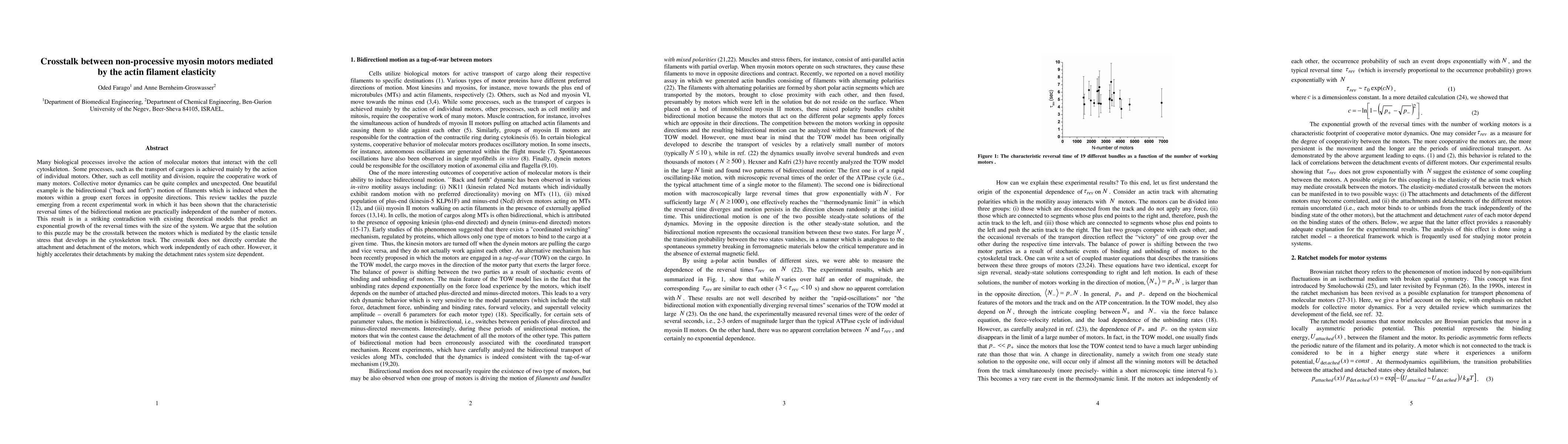 Many biological processes involve the action of molecular motors that interact with the cell cytoskeleton. Some processes, such as the transport of cargoes is achieved mainly by the action of individual motors. Other, such as cell motility and division, require the cooperative work of many motors. Collective motor dynamics can be quite complex and unexpected. One beautiful example is the bidirectional ("back and forth") motion of filaments which is induced when the motors within a group exert forces in opposite directions. This review tackles the puzzle emerging from a recent experimental work in which it has been shown that the characteristic reversal times of the bidirectional motion are practically independent of the number of motors. This result is in a striking contradiction with existing theoretical models that predict an exponential growth of the reversal times with the size of the system. We argue that the solution to this puzzle may be the crosstalk between the motors which is mediated by the elastic tensile stress that develops in the cytoskeleton track. The crosstalk does not directly correlate the attachment and detachment of the motors, which work independently of each other. However, it highly accelerates their detachments by making the detachment rates system size dependent.