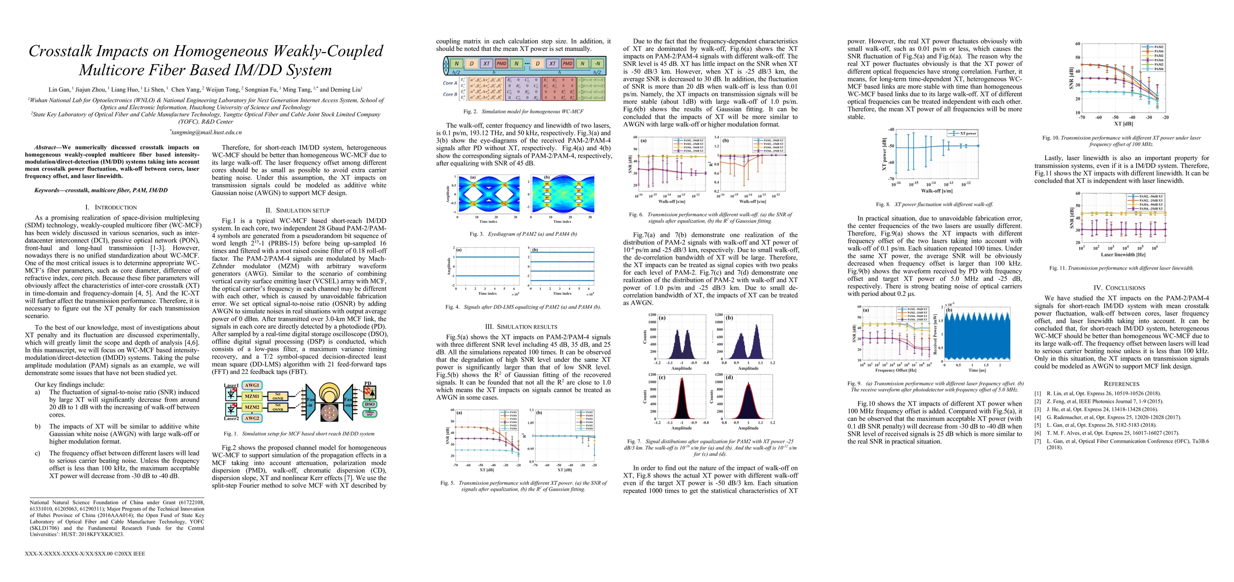 Summary: This paper numerically investigates crosstalk effects in homogeneous weakly-coupled multicore fiber systems using IM/DD, considering factors like mean crosstalk power fluctuation, core walk-off, laser frequency offset, and laser linewidth. The study aims to understand how these elements influence system performance.