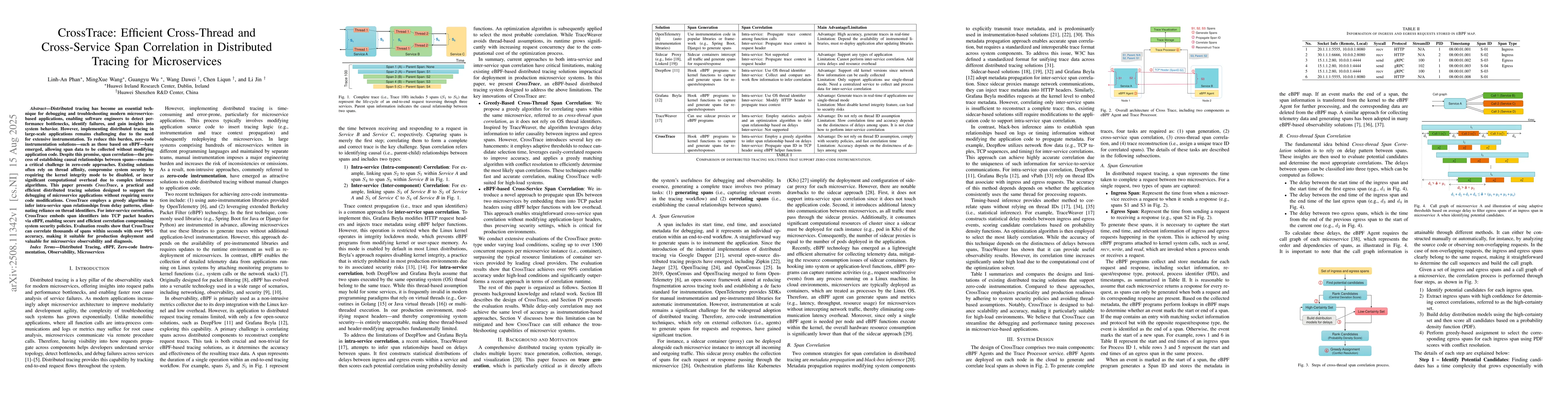 Distributed tracing has become an essential technique for debugging and troubleshooting modern microservice-based applications, enabling software engineers to detect performance bottlenecks, identify failures, and gain insights into system behavior. However, implementing distributed tracing in large-scale applications remains challenging due to the need for extensive instrumentation. To reduce this burden, zero-code instrumentation solutions, such as those based on eBPF, have emerged, allowing span data to be collected without modifying application code. Despite this promise, span correlation, the process of establishing causal relationships between spans, remains a critical challenge in zero-code approaches. Existing solutions often rely on thread affinity, compromise system security by requiring the kernel integrity mode to be disabled, or incur significant computational overhead due to complex inference algorithms. This paper presents CrossTrace, a practical and efficient distributed tracing solution designed to support the debugging of microservice applications without requiring source code modifications. CrossTrace employs a greedy algorithm to infer intra-service span relationships from delay patterns, eliminating reliance on thread identifiers. For inter-service correlation, CrossTrace embeds span identifiers into TCP packet headers via eBPF, enabling secure and efficient correlation compromising system security policies. Evaluation results show that CrossTrace can correlate thousands of spans within seconds with over 90% accuracy, making it suitable for production deployment and valuable for microservice observability and diagnosis.