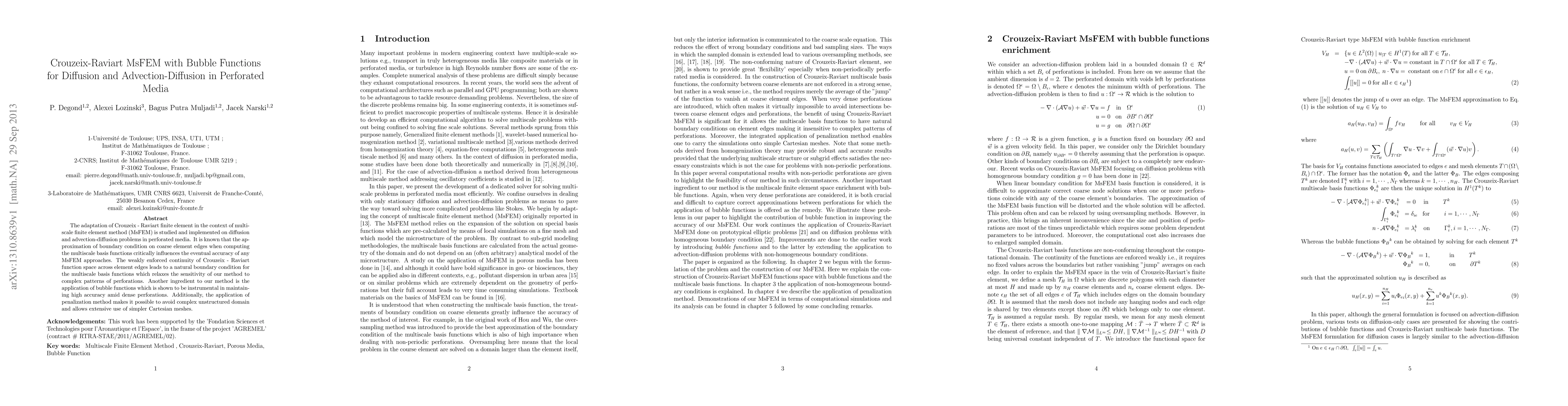 This paper explores the Crouzeix-Raviart finite element method within a multiscale framework for solving diffusion and advection-diffusion problems in perforated media. The use of bubble functions and weakly enforced continuity enhances accuracy and robustness, particularly in complex perforation patterns.