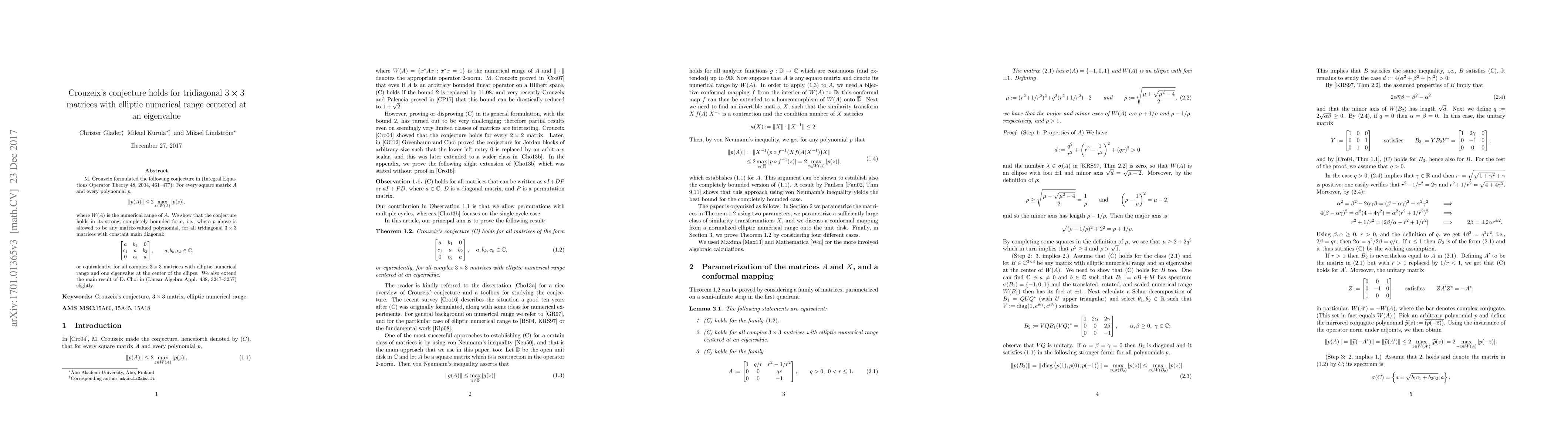 M. Crouzeix formulated the following conjecture in (Integral Equations Operator Theory 48, 2004, 461--477): For every square matrix $A$ and every polynomial $p$, $$ \|p(A)\| \le 2 \max_{z\in W(A)}|p(z)|, $$ where $W(A)$ is the numerical range of $A$. We show that the conjecture holds in its strong, completely bounded form, i.e., where $p$ above is allowed to be any matrix-valued polynomial, for all tridiagonal $3\times 3$ matrices with constant main diagonal: $$ \left[\begin{matrix}a&b_1&0\\c_1&a&b_2\\0&c_2&a\end{matrix}\right],\qquad a,b_k,c_k\in\mathbb C, $$ or equivalently, for all complex $3\times 3$ matrices with elliptic numerical range and one eigenvalue at the center of the ellipse. We also extend the main result of D. Choi in (Linear Algebra Appl. 438, 3247--3257) slightly.
