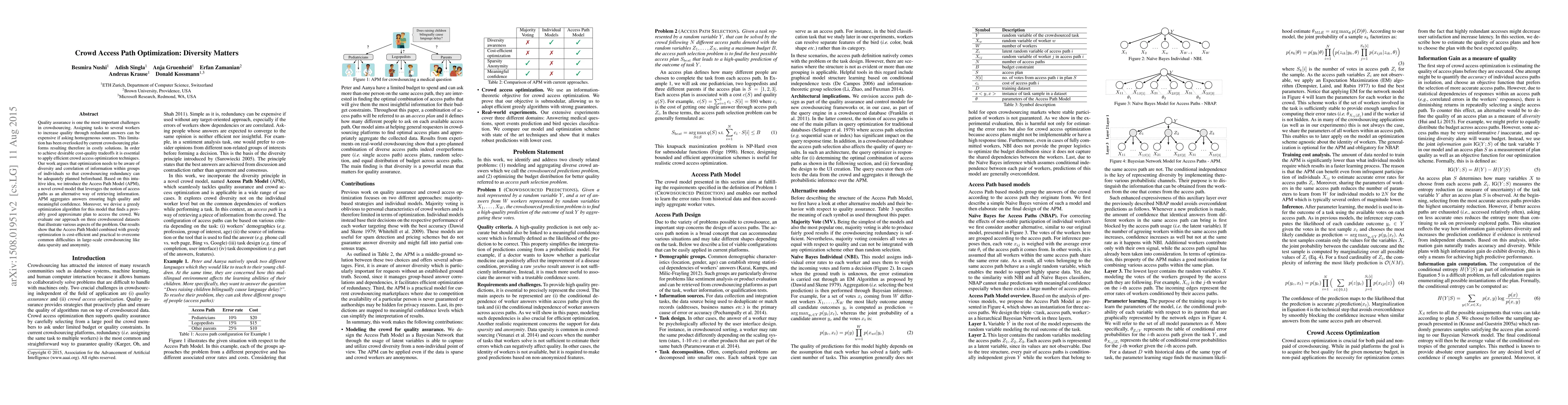 Quality assurance is one the most important challenges in crowdsourcing. Assigning tasks to several workers to increase quality through redundant answers can be expensive if asking homogeneous sources. This limitation has been overlooked by current crowdsourcing platforms resulting therefore in costly solutions. In order to achieve desirable cost-quality tradeoffs it is essential to apply efficient crowd access optimization techniques. Our work argues that optimization needs to be aware of diversity and correlation of information within groups of individuals so that crowdsourcing redundancy can be adequately planned beforehand. Based on this intuitive idea, we introduce the Access Path Model (APM), a novel crowd model that leverages the notion of access paths as an alternative way of retrieving information. APM aggregates answers ensuring high quality and meaningful confidence. Moreover, we devise a greedy optimization algorithm for this model that finds a provably good approximate plan to access the crowd. We evaluate our approach on three crowdsourced datasets that illustrate various aspects of the problem. Our results show that the Access Path Model combined with greedy optimization is cost-efficient and practical to overcome common difficulties in large-scale crowdsourcing like data sparsity and anonymity.