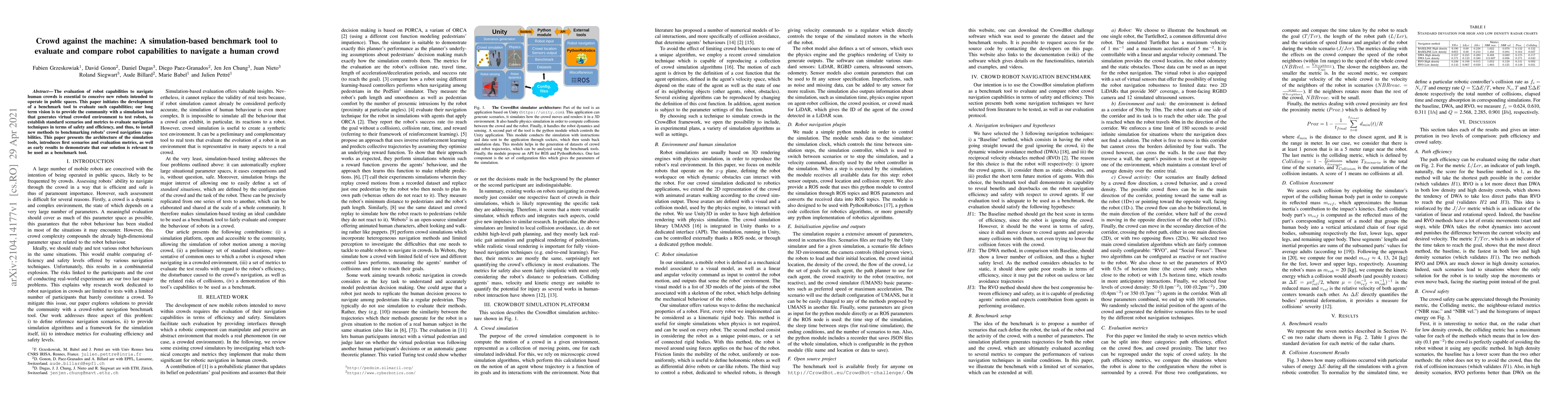 The evaluation of robot capabilities to navigate human crowds is essential to conceive new robots intended to operate in public spaces. This paper initiates the development of a benchmark tool to evaluate such capabilities; our long term vision is to provide the community with a simulation tool that generates virtual crowded environment to test robots, to establish standard scenarios and metrics to evaluate navigation techniques in terms of safety and efficiency, and thus, to install new methods to benchmarking robots' crowd navigation capabilities. This paper presents the architecture of the simulation tools, introduces first scenarios and evaluation metrics, as well as early results to demonstrate that our solution is relevant to be used as a benchmark tool.
